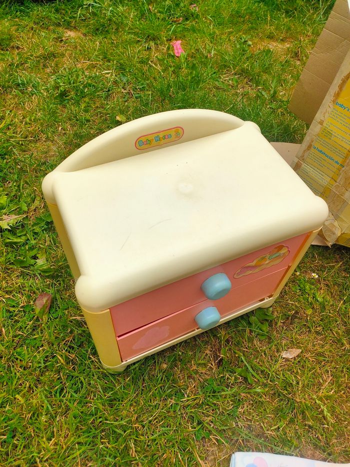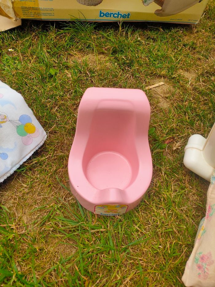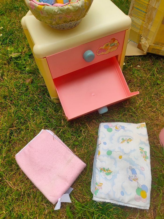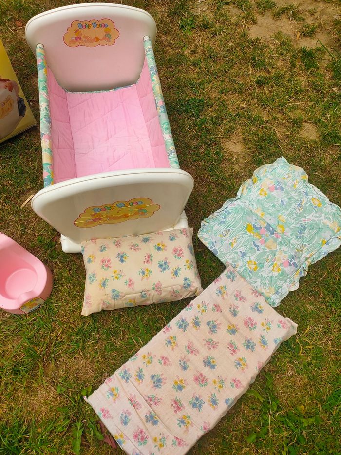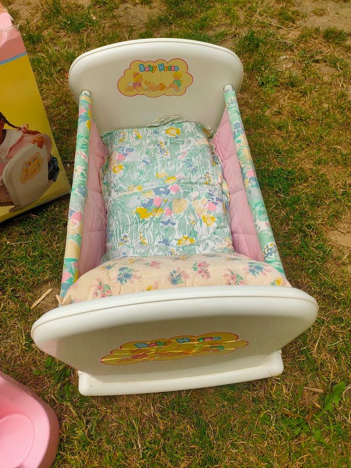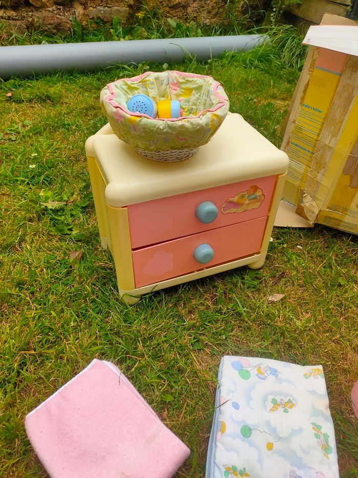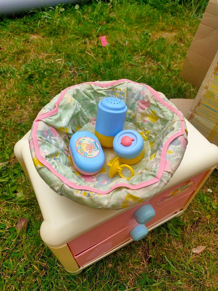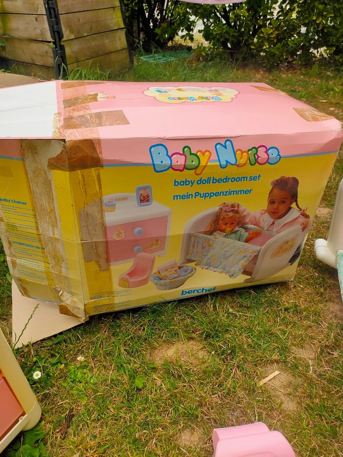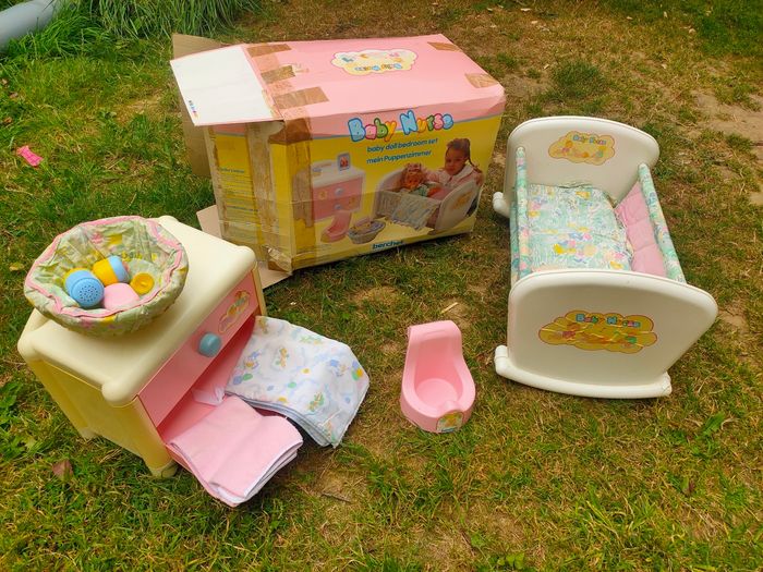 Ensemble chambre pour poupée baby Nurse avec un berceau, une commode 2 tiroirs un pot et un panier avec petite dinette. Il est complet avec le linge de lit + matelas et oreillers. Le jeu est vintage et doit avoir 40 ans. Il est vendu dans son carton d'origine. Il est en très bon état pour son âge, attention cependant le plastique blanc de la commode a jaunit et le textile a également jaunit a certains endroits voir piqué, certains autocollants sont également abîmé. C'est un jeu d'occasion ancien donc ces défauts sont normaux...