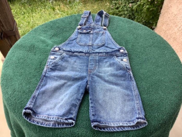Salopette jeans courte , 6 ans , 2 poches sur les côtés et 2 poches derrière , ouverture de chaque côté par des boutons .