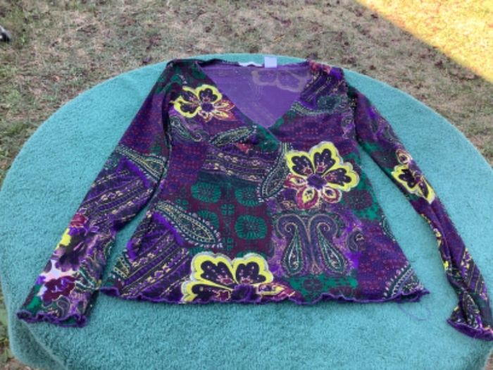 Tee-shirts blouse multicolores violet,jaune, vert, Bordeaux, blanc , le corps est doublé pas les manches qui sont longues, taille 38/40 , marque La redoute.