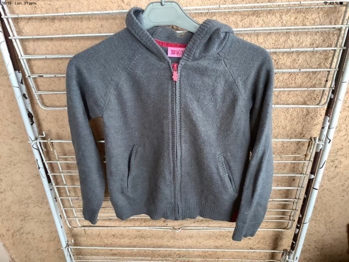 Gilet Gris avec capuche , 2 poches , gilet zipée , 10 ans .