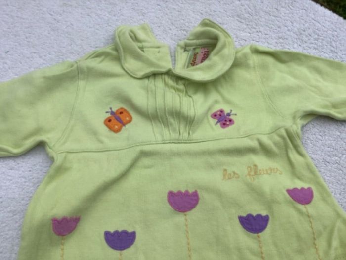 Pull tunique DPAM ,manches longues , col rond , fermeture dos par 3 boutons, 12 moi , en coton épais vert anis .