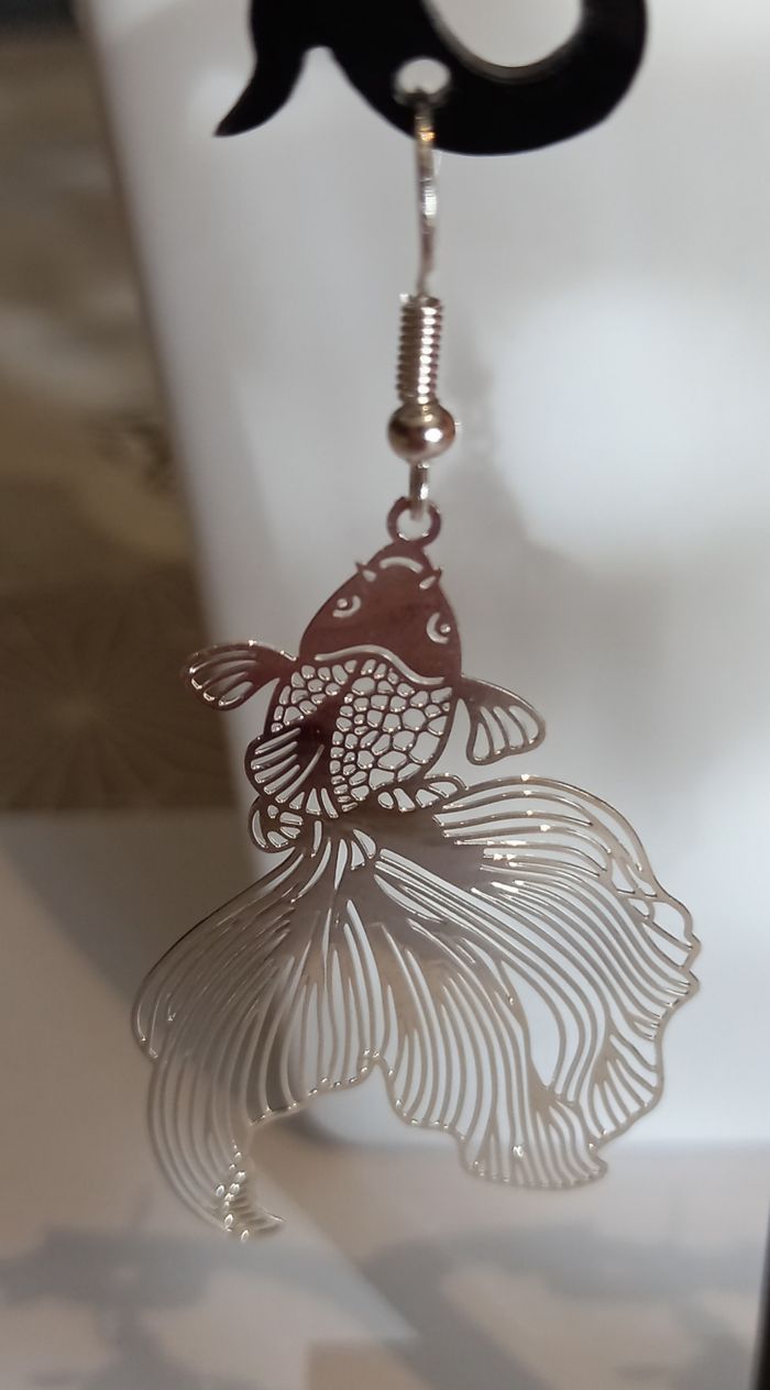1 jolie paire de boucles d'oreilles poissons tropicaux. Coloris argenté, très fine et légère à porter. Hauteur : 6 cms. Boucles neuves sous blister. N'hésitez pas à regarder mes autres ventes . Envoi rapide et soigné.