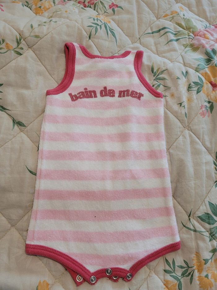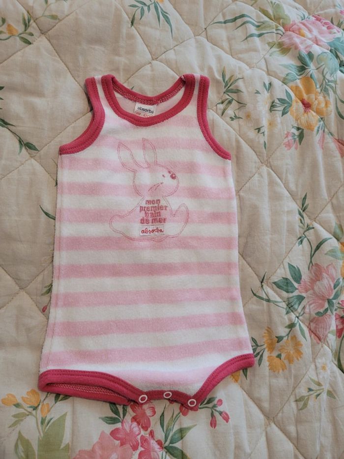 #6moisfillekabra06 Pyjashort en éponge blanc rayé rose, pour bébé fille 6 mois, avec imprimé "mon premier bain de mer" Composition : 83% coton, 17% polyester. Lavage à 40°.