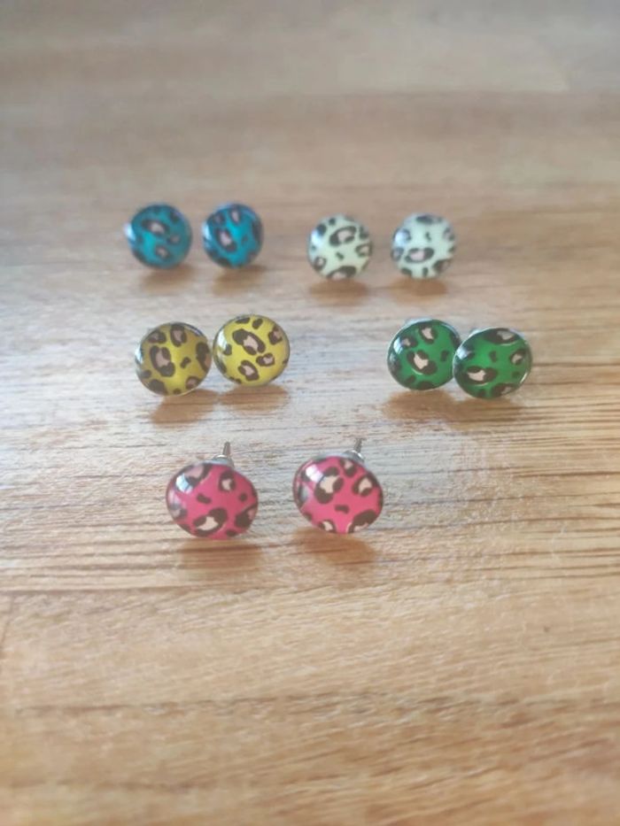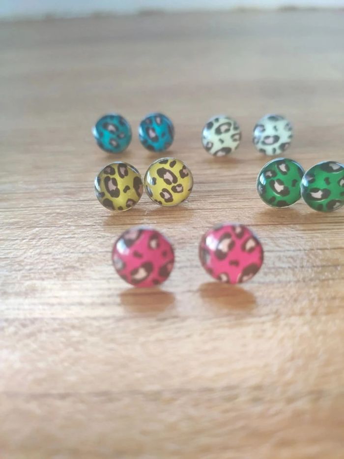 Fond coloré avec taches de léopard. Rondes, diamètre 1 cm. Neuves, jamais portées. Convient aussi bien à une adulte qu'à une ado, pour assortir aux tenues ! #vulariBijoux