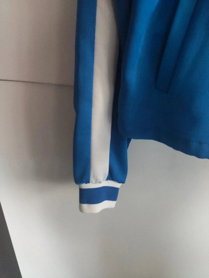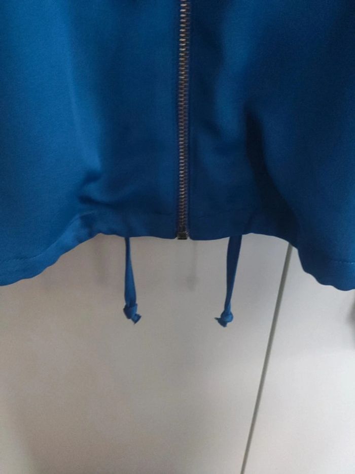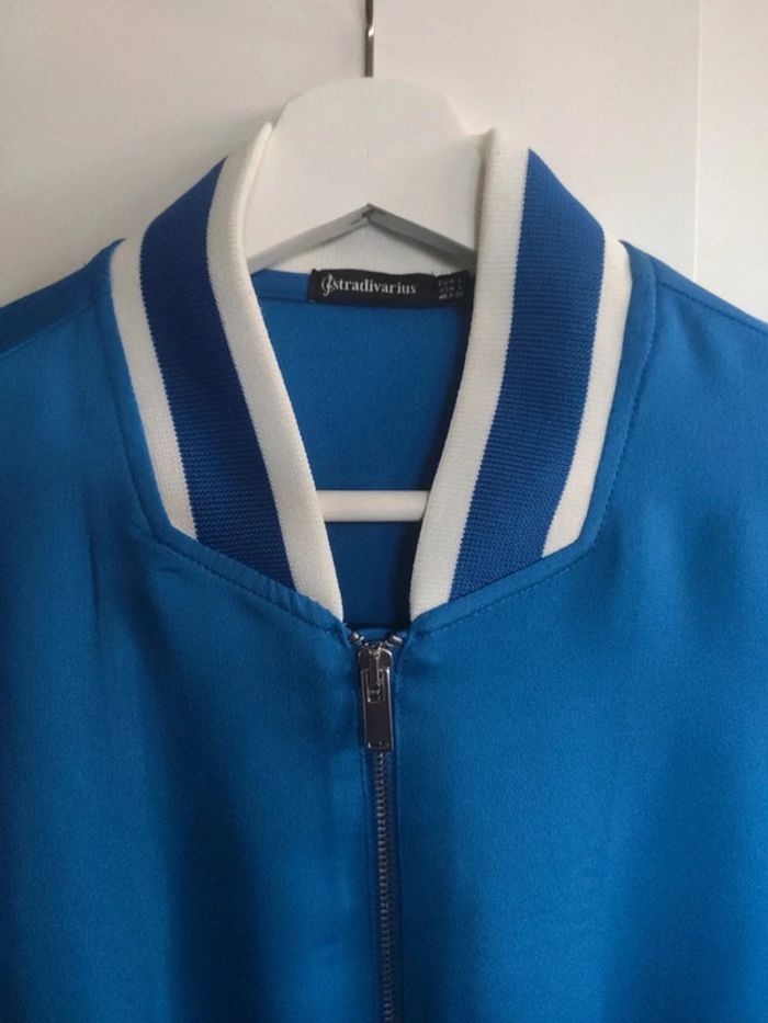 Blouson veste quasi neuf, peu porté, style Teddy ou bomber très fin. Bleu électrique et blanc. Fermeture éclair. Base resserable par un lien. Acheté dans un magasin Stradivarius. Taille L #vulariFemmesL40 #vulariStradivarius