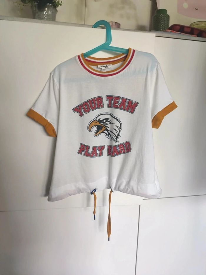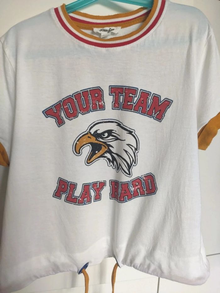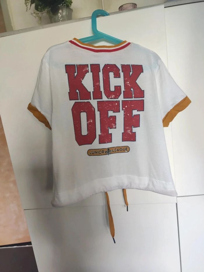 T-shirt très sympa style sportif américain avec un aigle sur le devant et kick off sur le dos. Ganse au col et aux manches, lien de serrage à la taille. Très bon état. Taille xs. Acheté dans un magasin Jennyfer. Convient aussi à une ado #vulariFemmesXS34