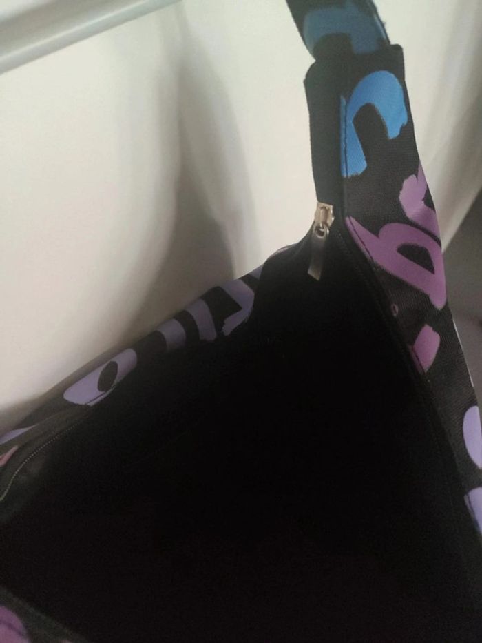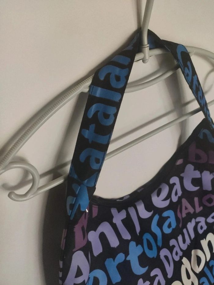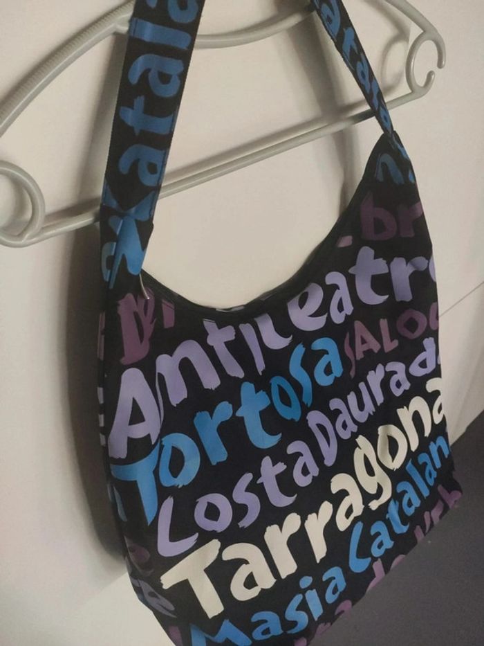 Sac besace fourre tout solide, semble être un peu imperméabilisé, avec des inscriptions de villes de la Costa dorada en Espagne : tortosa, salou,, Tarragona, delta de lebre et la Catalogne sur la anse. Comme neuf, pas sûr qu'il ait été utilisé, petite poche intérieure, et fermeture du sac par fermeture éclair. Largeur 43 cm, hauteur 31 cm, profondeur 17 cm, hauteur totale avec la anse 59 cm. Sac noir avec inscription bleu, blanc et violet #vulariFemmesS36 #vulariFemmesM38 #vulariFilles12ans #vulariFilles14ans #vulariSacs