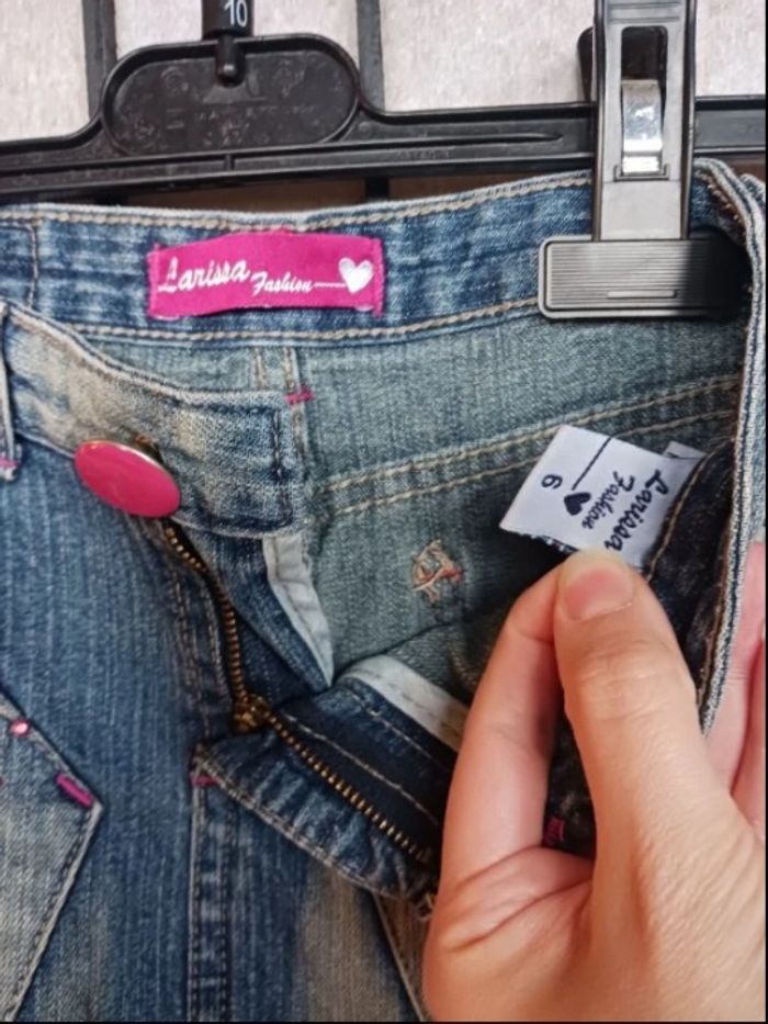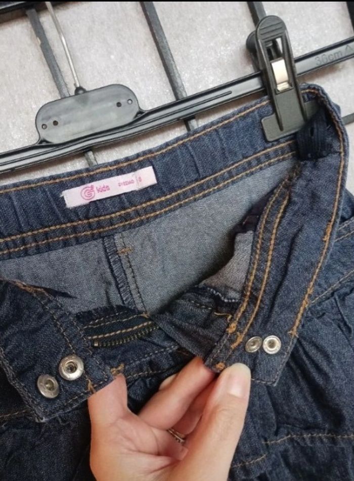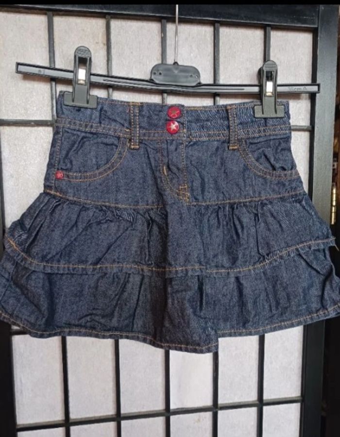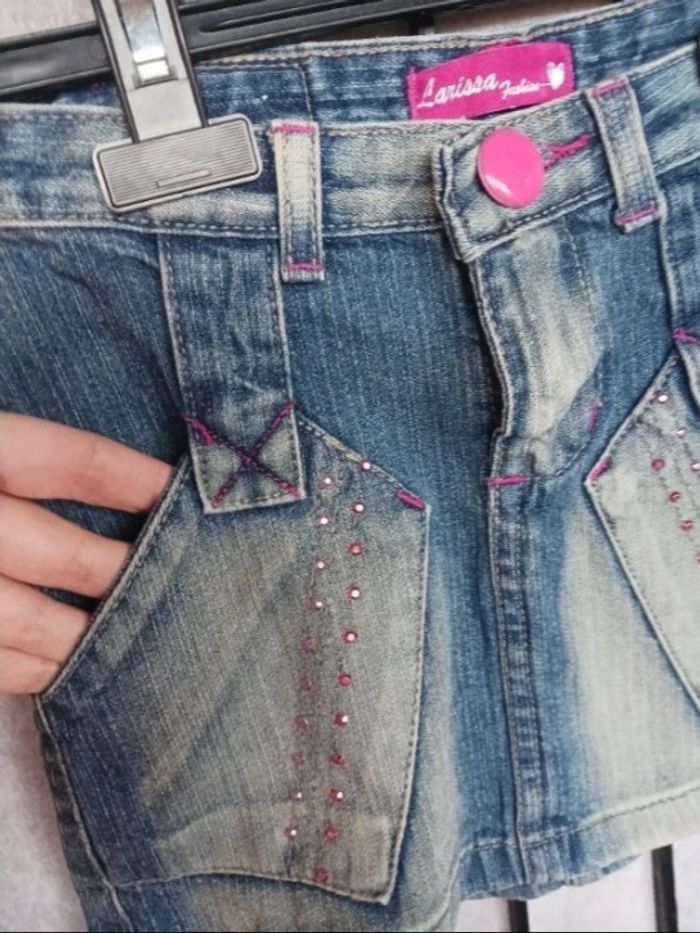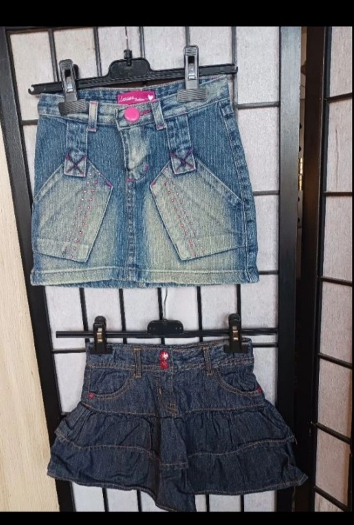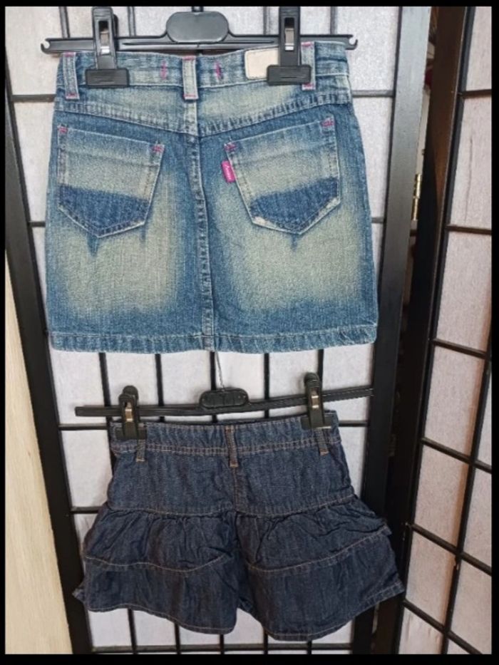 2 jupes en jeans en 6 ans : *La 1ere - bleu et rose : Marque Larissa Fashion, passage pour une ceinture *La 2ème - bleu marine et couture beige : Marque Kids by Gemo, passage pour une ceinture + élastique à la taille