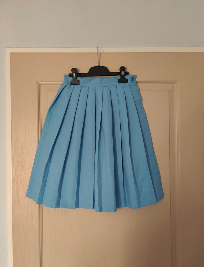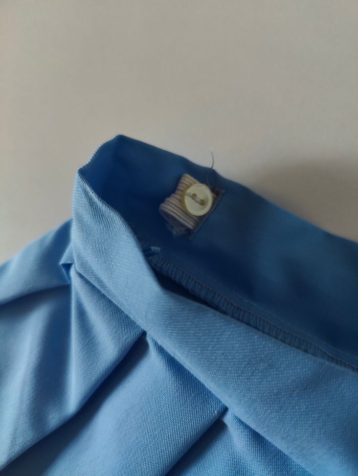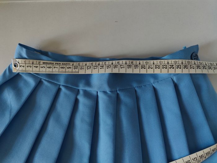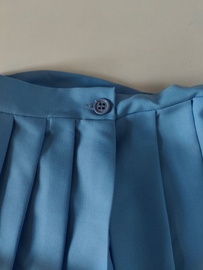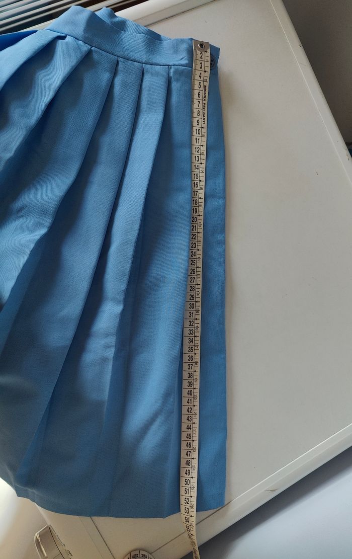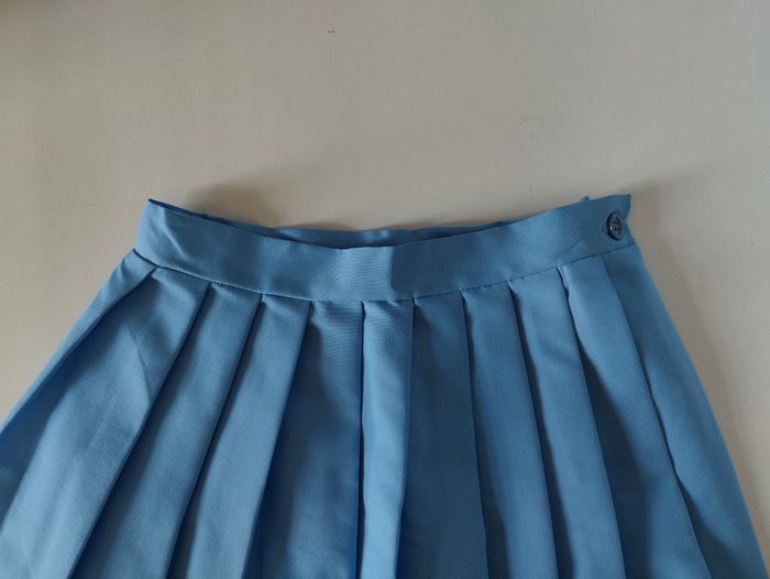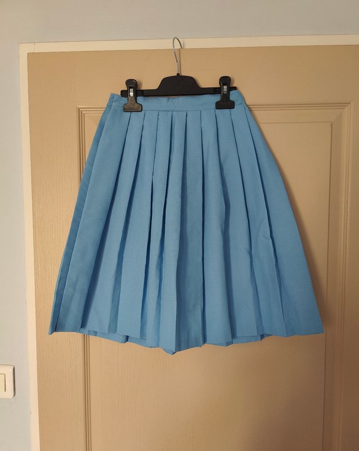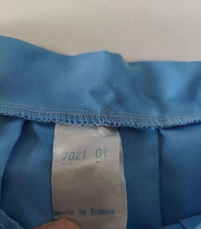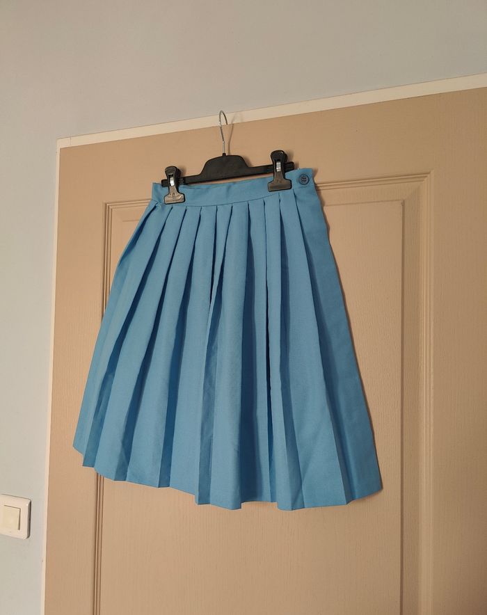 Jolie jupe plissée bleue Taille réglable élastiquement Fermeture par bouton sur le côté Fabrication française Pas de taille lisible Ma fille la portait en 10-12 ans Voir dimensions sur photos