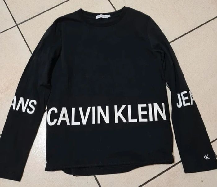 Bonjour je vend ce tee shirt a manches longues excellent état calvin Klein taille 12 ans prix 6€