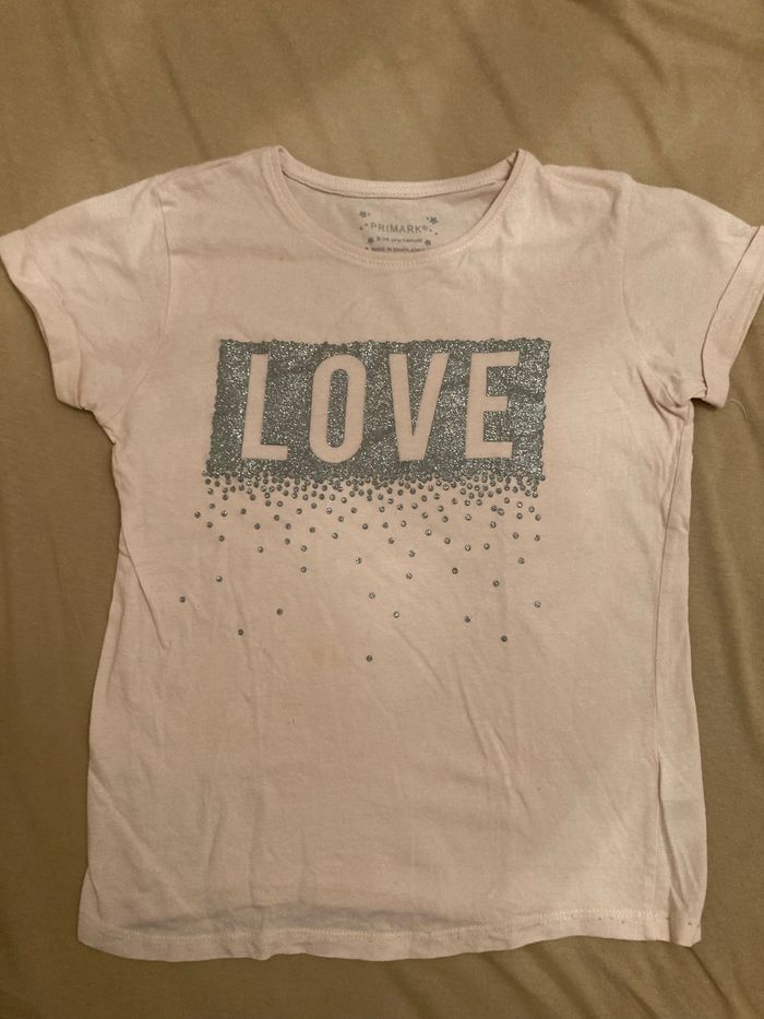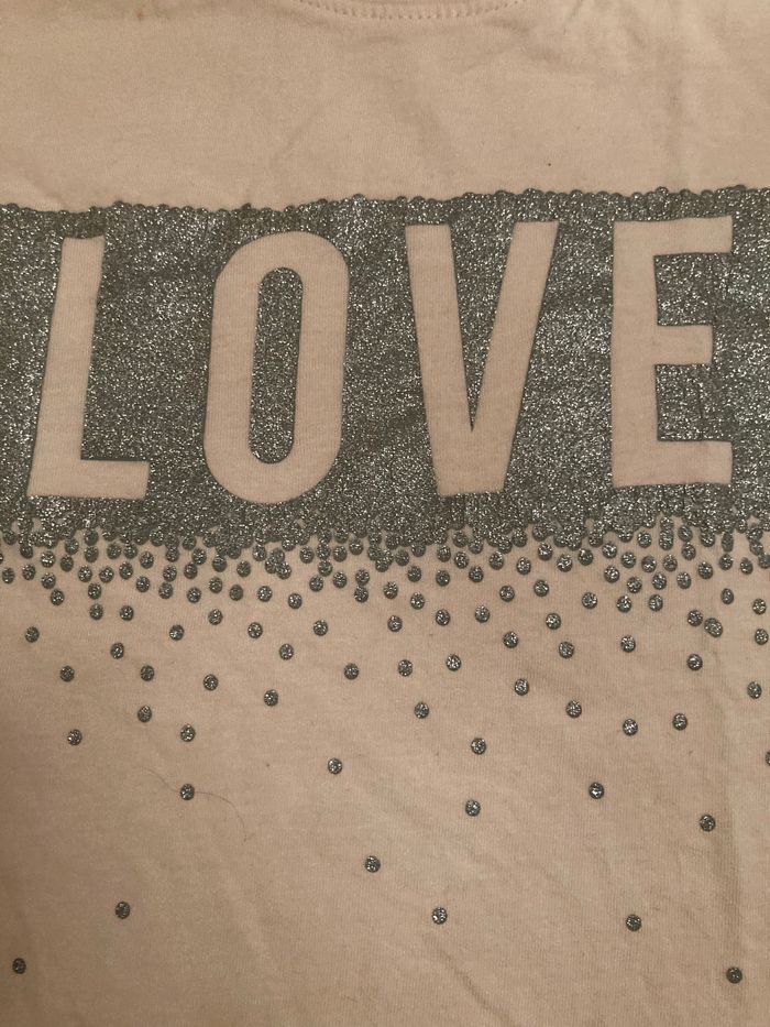 Joli tee-shirt à message love Coloris rose saumoné clair En excellent état sans trous ni taches Taille 9/10 ans Non négociable Envoi rapide et soigné