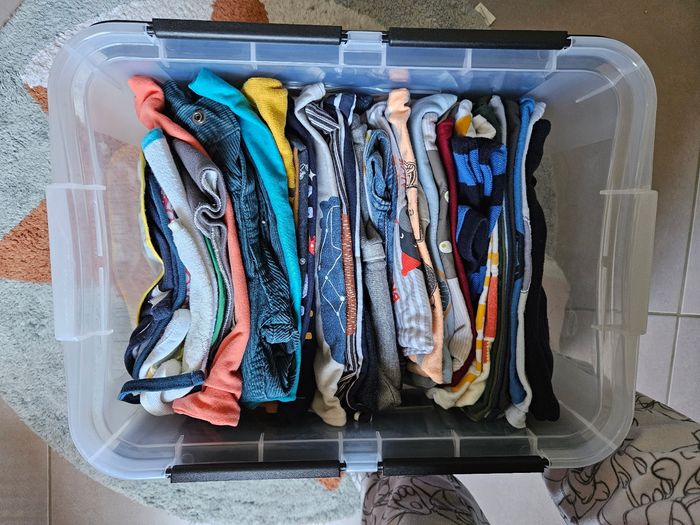 Lot pour bébé Il y a de tout : pyjama, pantalon, t-shirt, pulls, gilets, bavoirs etc Pour les tailles ça va du 3 mois au 18 mois Le tout en très bon état