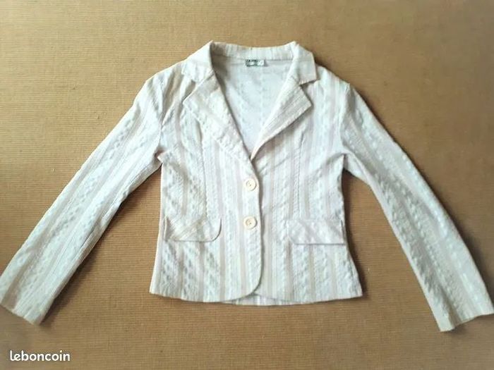 Belle Veste Tailleur, T: 36 Couleur: BEIGE, ROSE PALE, BLANC- RAYURES Deux boutons, deux poches factices LEGERE et AGREABLE !!