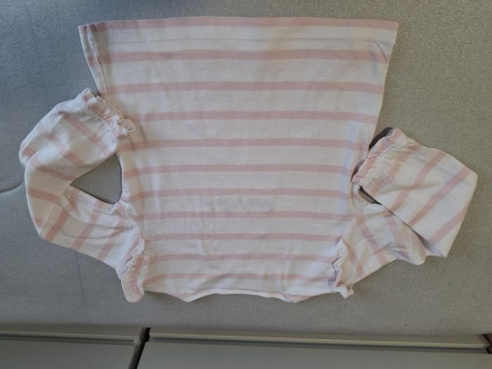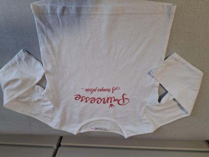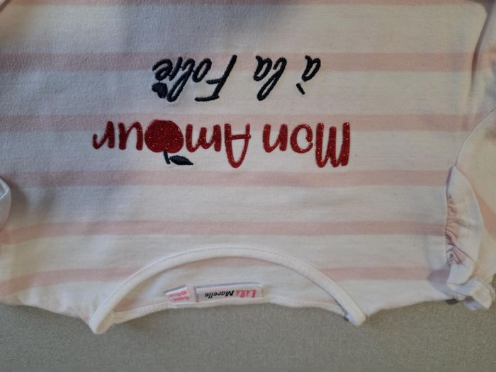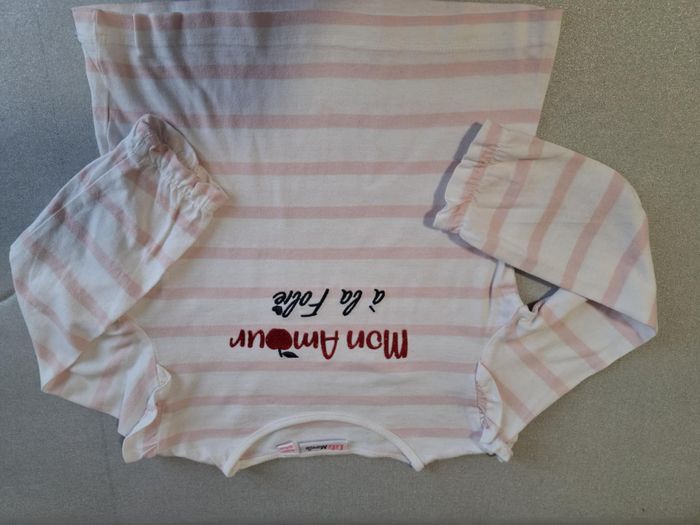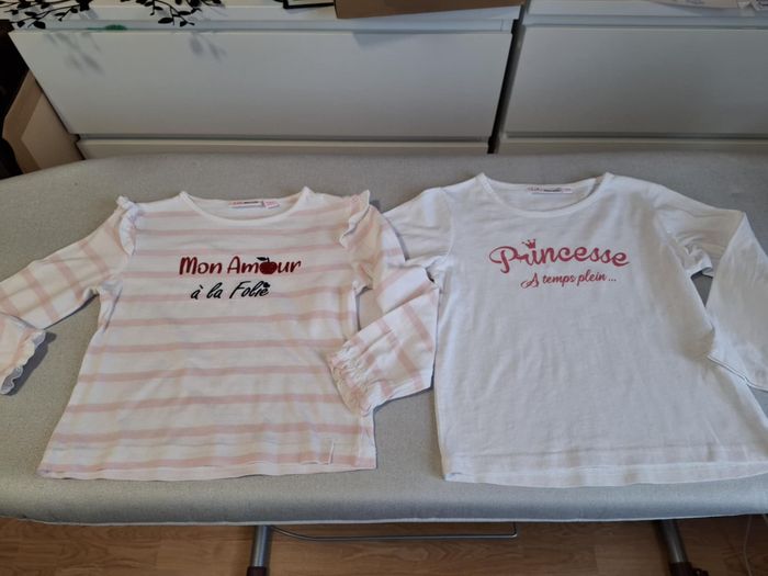 Lot de 2 beaux sweats pour fille, marque LILI MARELLE, en taille 4 ans, un rayé blanc/rose pâle, petits volants épaules, inscription "Mon Amour à la folie" en relief et brodé, bas des manches élastiqués, et un tout blanc, imprimé "Princesse à temps plein" de couleur rose, les 2 en 100 % coton, lavables en machine à 30° et en très bon état, peu portés.