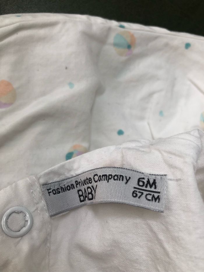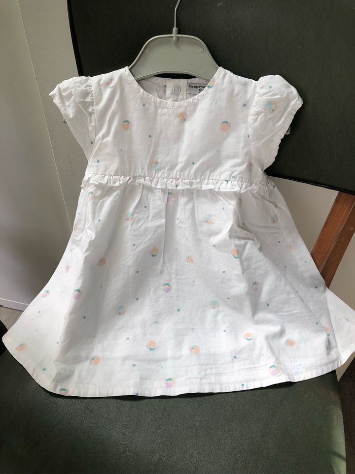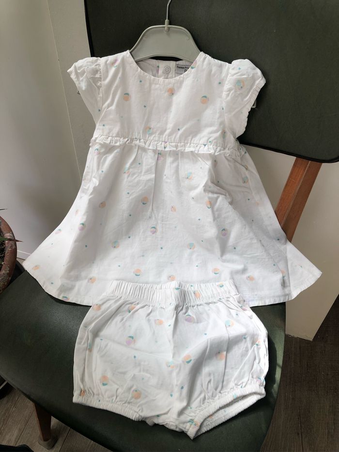 Robe de cérémonie blanche avec petits décors pastels avec short assorti Robe doublée Fermeture dans le dos par pressions Neuve jamais portée Taille 6mois Prix 6€