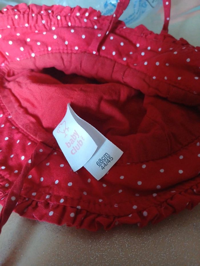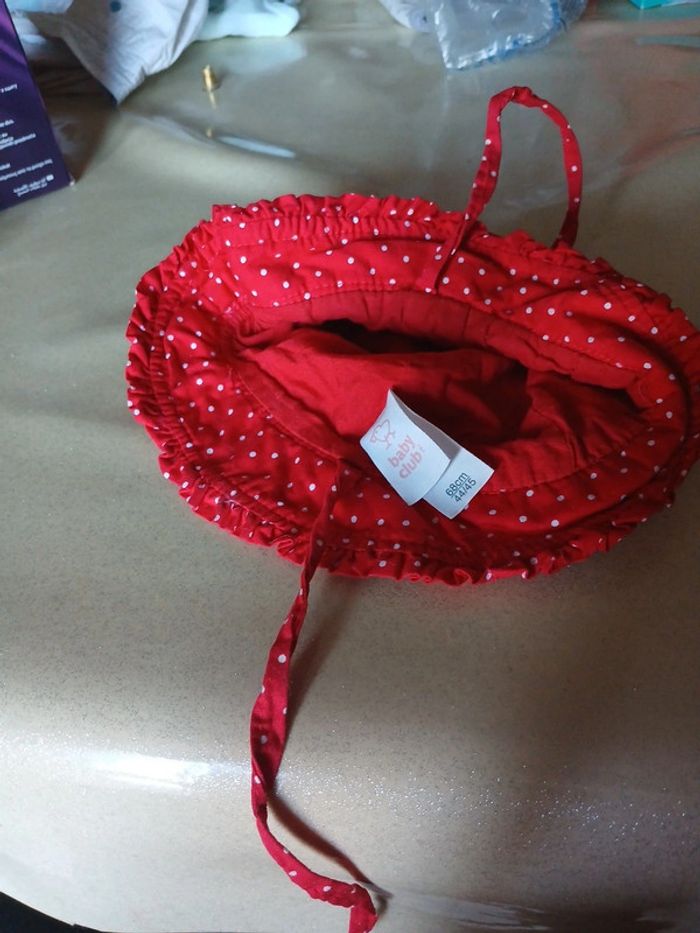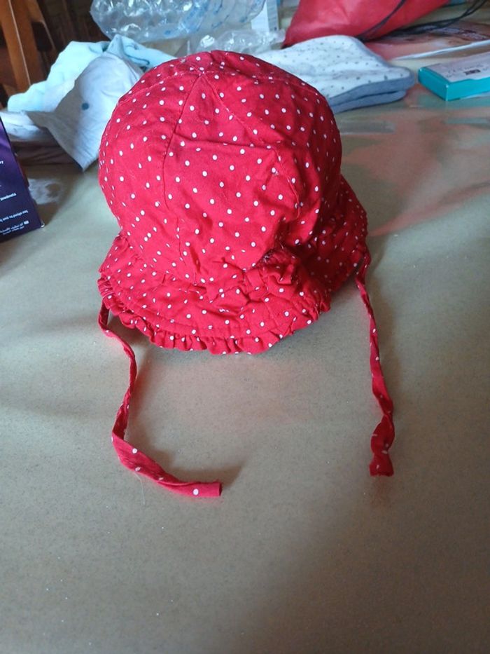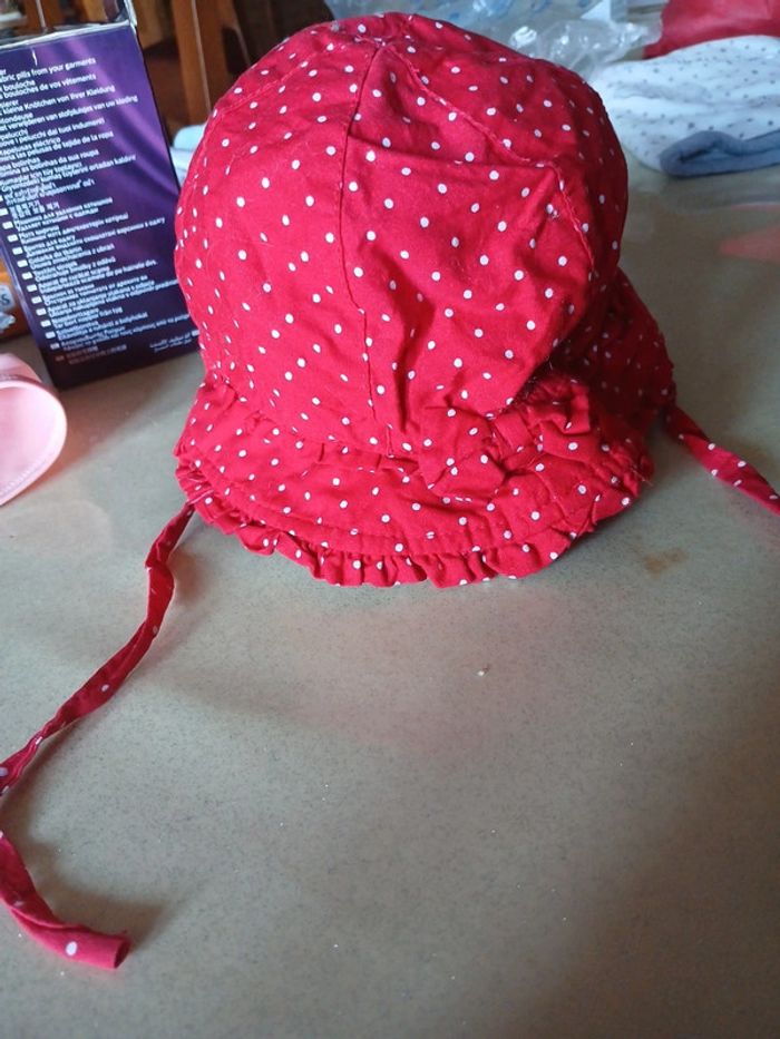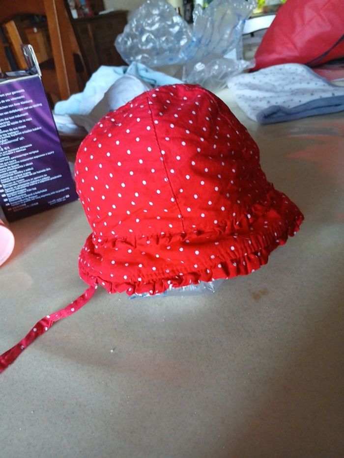 Chapeau tissu rouge à pois blancs avec lien pour attacher sous le cou. Très bon état. Taille 44/45 ( 68 cm)
