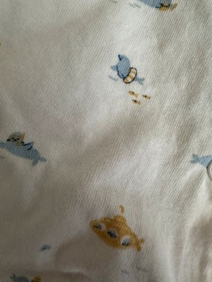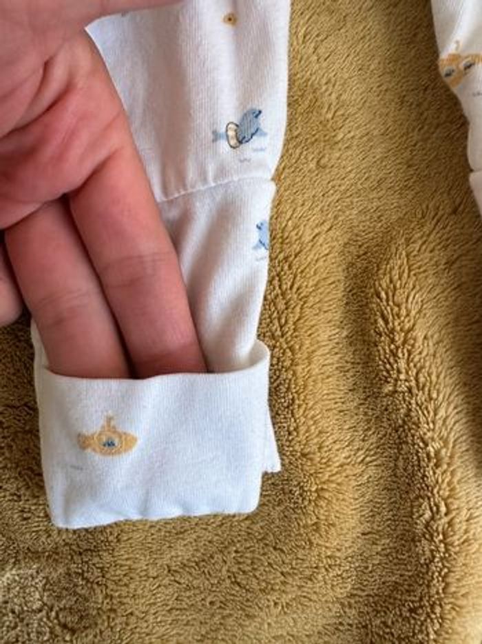 Combi grenouillère dite dors bien bébé de chez Vertbaudet Taille naissance 50 cm Couleur blanc/écru avec motifs marins (phoque, sous-marin Coton biologique tout léger, parfait pour l’été Pressions intégrales Neuf Collection actuelle de chez Vertbaudet acheté 20 euros en avril. Les pieds sont soit ouverts soit fermés avec le tissu voir photo D’autres articles bébé dans dressing avec réductions sur lot activées => bébé naissance et 1 mois : #polka0mois #polka1mois => bébé naissance : #polka0mois