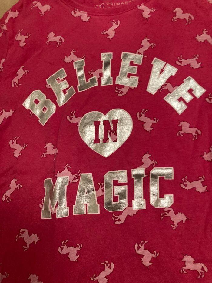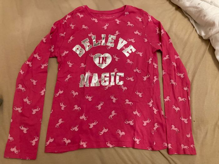 Tee-shirt à manches longues Coloris fushia motif argenté licorne believe magic Taille 9/10 ans En très bon état sans trous ni taches Non négociable Envoi rapide et soigné