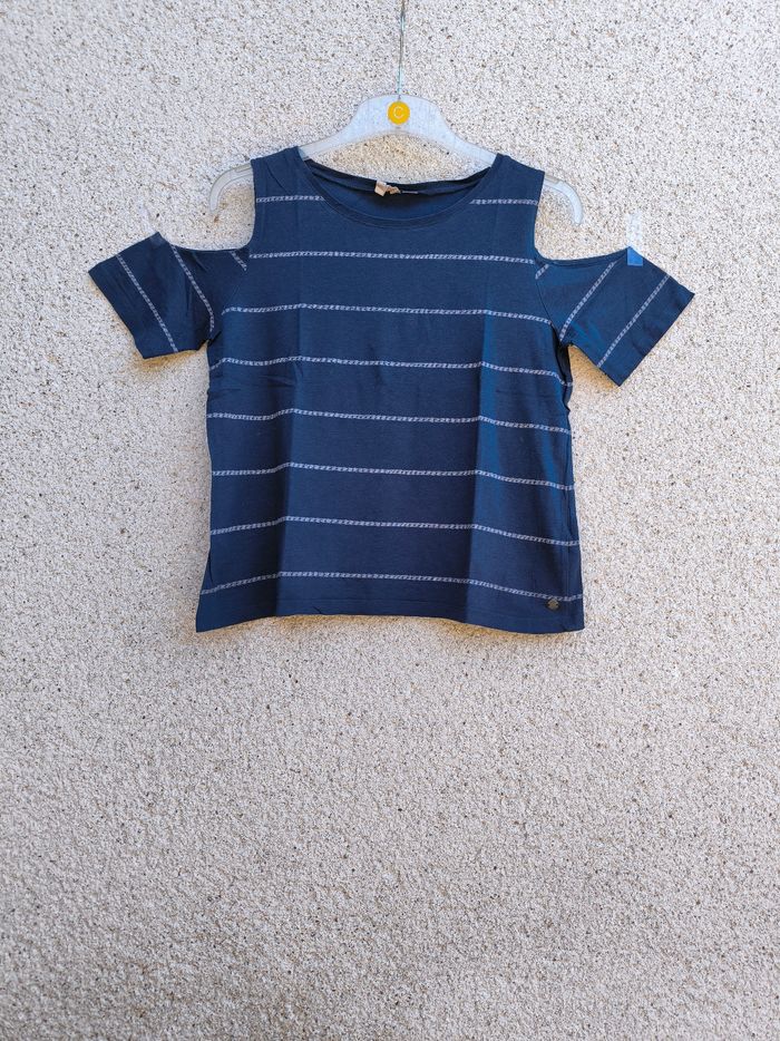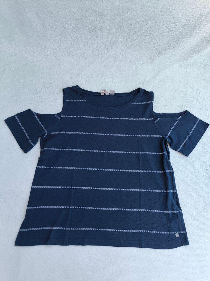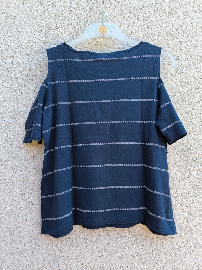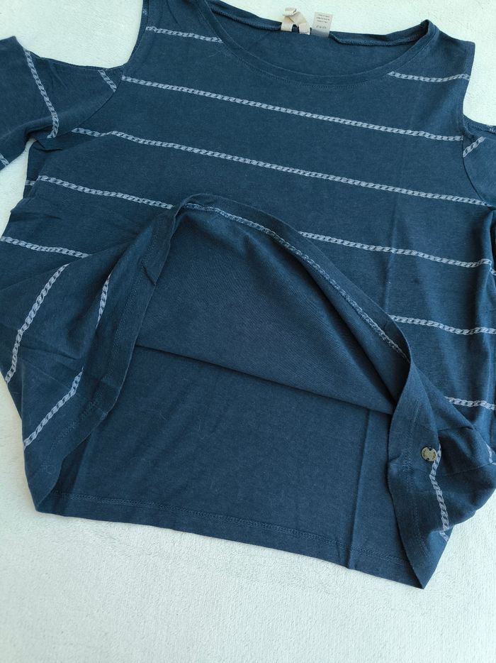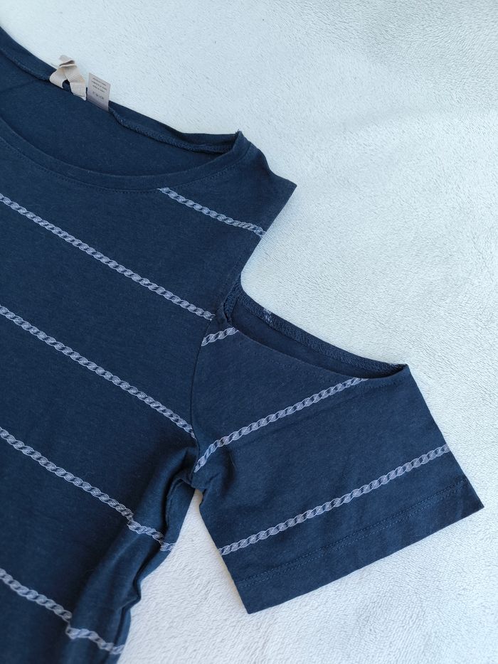 T-shirt à manches courtes et épaules dénudées Marque Roxy Taille S, 36 • Coloris marine, blanc • Rayures horizontales tressées • Col rond • Coton fin Largeur aisselle à aisselle non étirée : 46 cm Largeur aisselle à aisselle étirée au maximum : 67 cm Longueur totale : 53 cm Longueur aisselle : 35 cm Peu porté, en très bon état #evelyne_taille_36