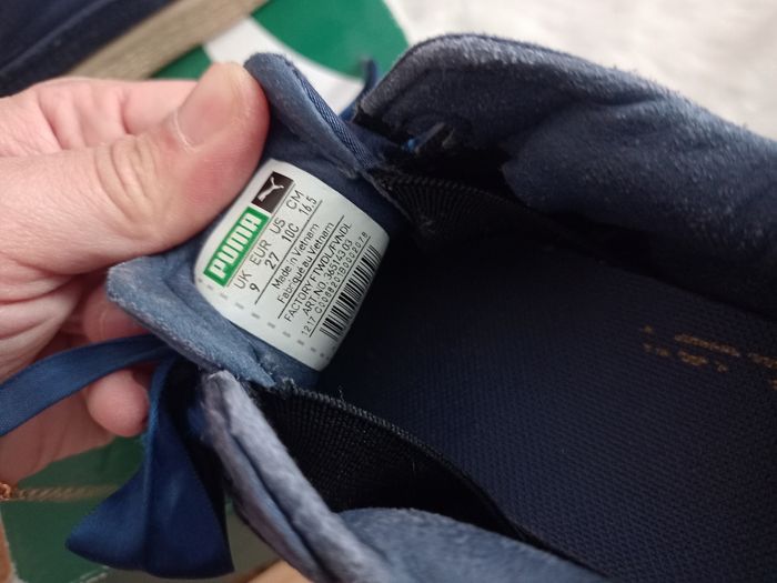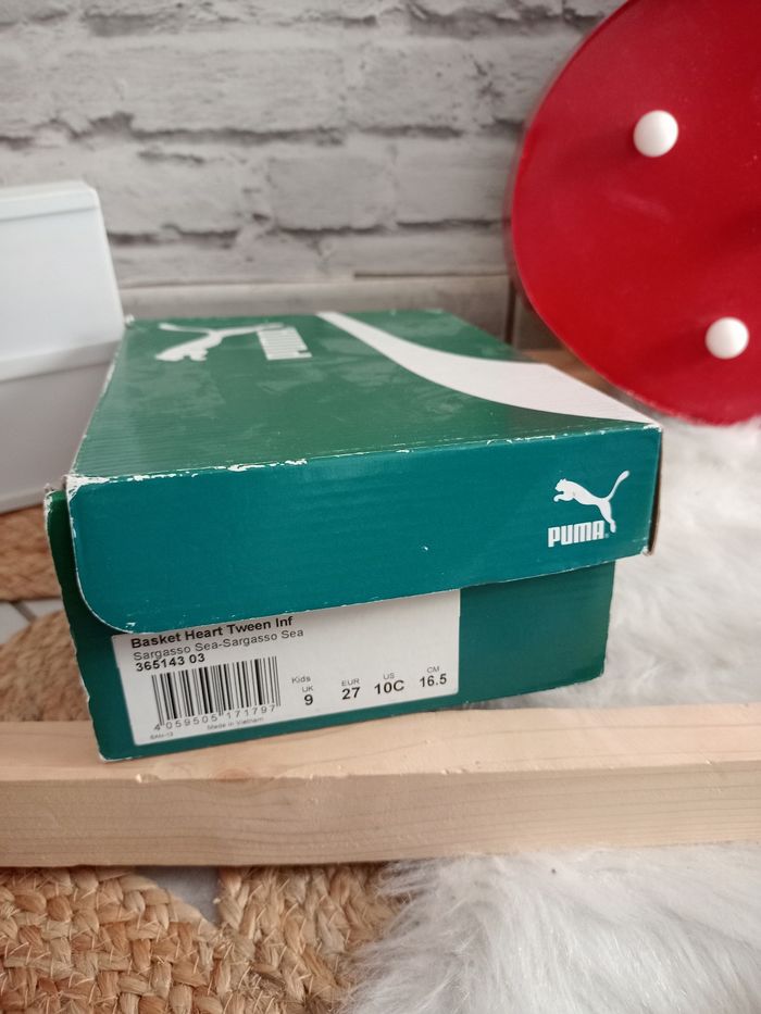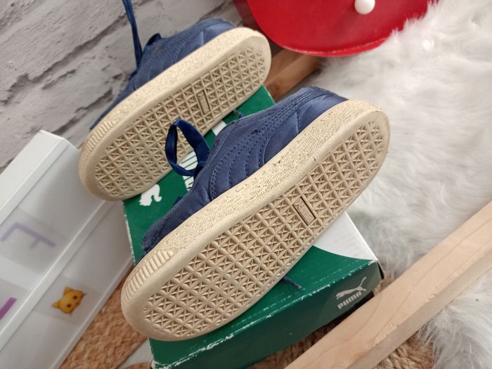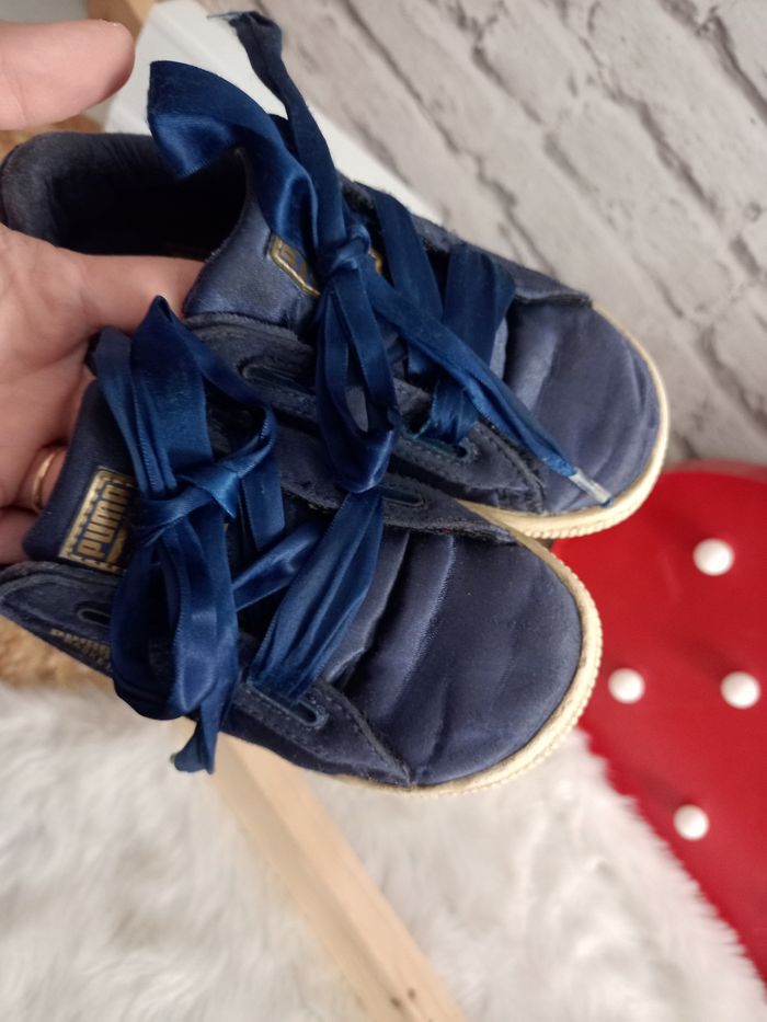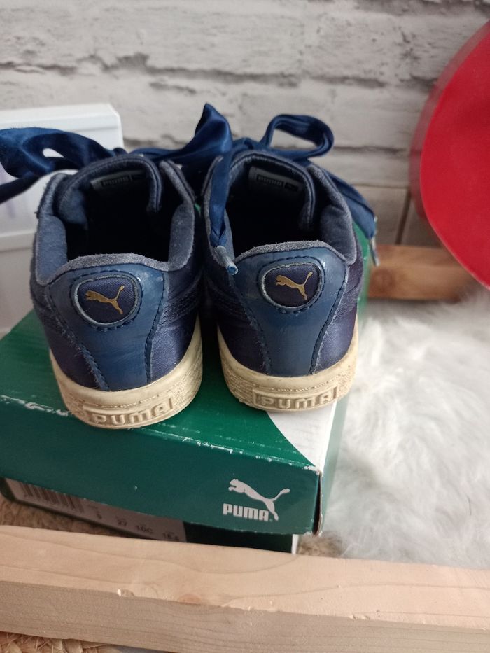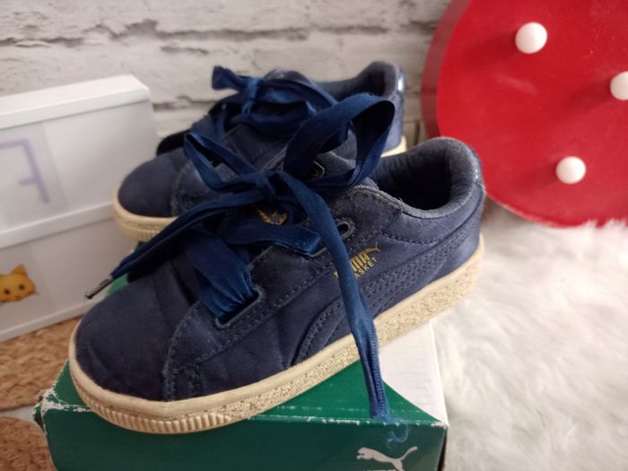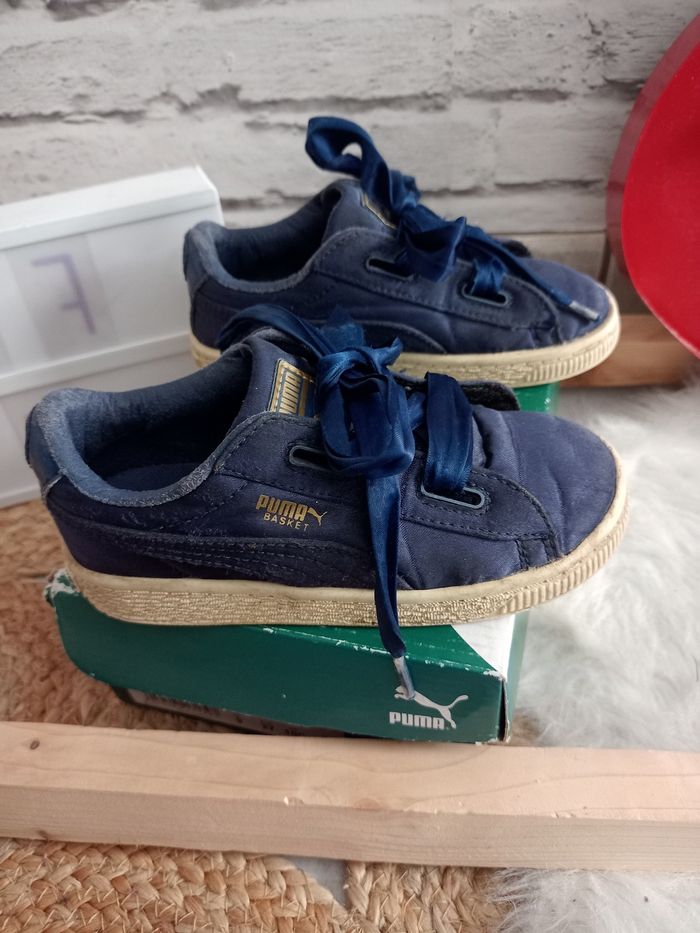 Paire de baskets bleues matière type satin ,lacets rubans déco -élastique en dessous. Bon état portées plusieurs fois . Taille 27 , marque puma . A vendre 12€