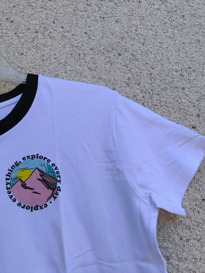 T-shirt à manches courtes Marque Pull & Bear Taille M, 38 • Coloris blanc, noir • Imprimé et inscription "Explore everything, explore every day" • Col rond • Coton fin Largeur épaule à épaule non étirée : 43 cm Largeur épaule à épaule étirée au maximum : 55 cm Largeur aisselle à aisselle non étirée : 46 cm Largeur aisselle à aisselle étirée au maximum : 62 cm Longueur totale : 56 cm Longueur aisselle : 36 cm Peu porté, en très bon état #evelyne_taille_38