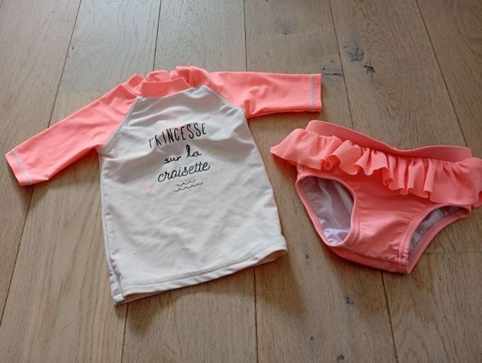 Maillot de bain 2 pièces en bon état légèrement abîmé voir photo de marque Kiabi et de taille 12 mois