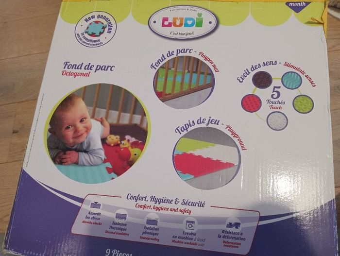 Fond de parc en bon état dans sa boîte d'origine mais qui a été scotché et un bordereau d'envoi collé dessus et des traces d'usure sur certaines plaques voir photo de marque Ludi