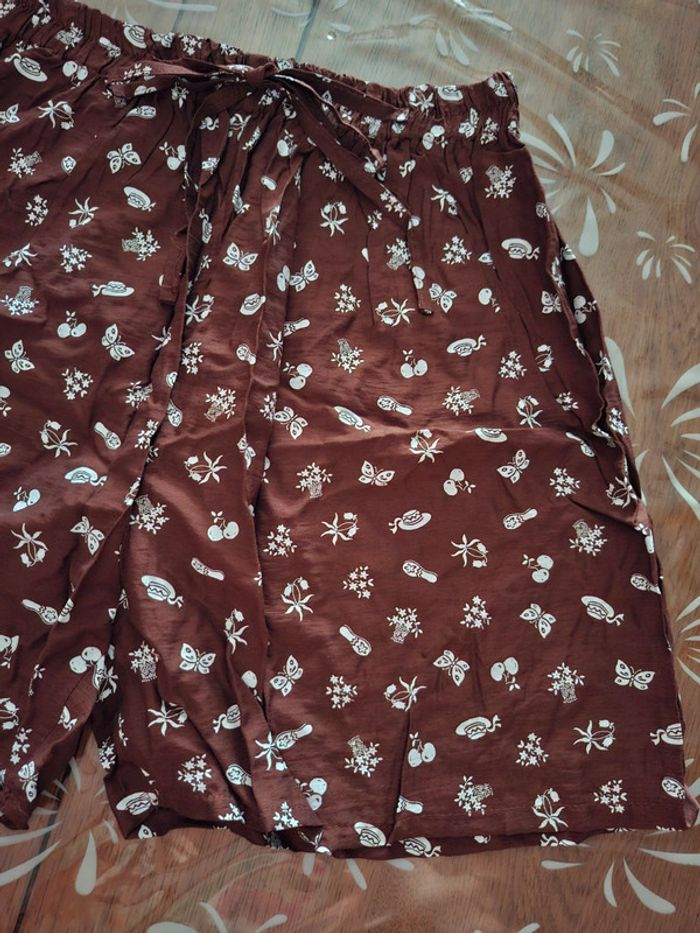 Short femme Taille unique Couleur marron et blanc A motifs Élastique à la taille Court État impeccable Longueur d'entre jambe : 10 cm Longueur totale : 39 cm Largeur de jambe : 32 cm Largeur globale au plus large : 55 cm