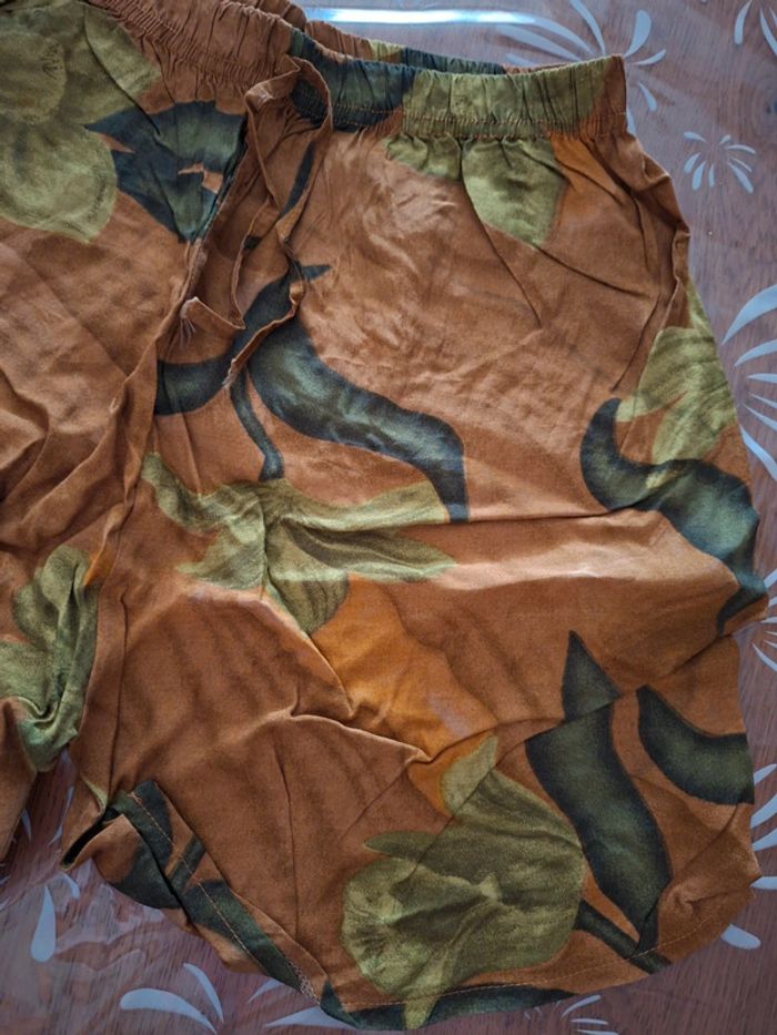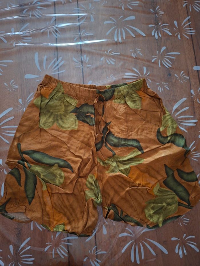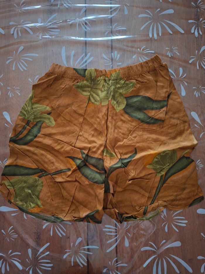 Short femme Taille unique Couleur marron et vert A motifs floral Élastique à la taille Court État impeccable Longueur d'entre jambe : 14 cm Longueur totale : 42 cm Largeur de jambe : 29 cm Largeur globale au plus large : 52 cm