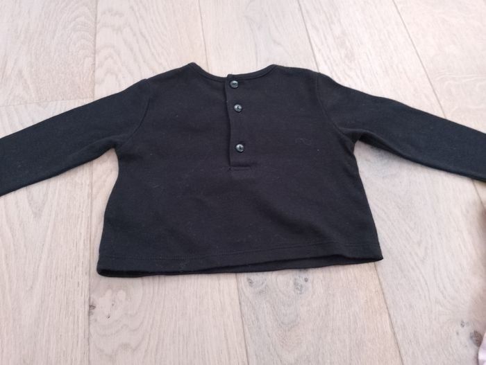 Lot 3 tee shirt manches longues en très bon état (le noir est de marque inconnue et de taille 12 mois, à rayures en bon état une légère tâche voir photo de marque tout simplement et de taille 12 mois, le rose est en très bon état de marque inconnue et de taille 12 mois)
