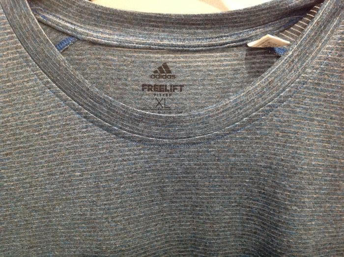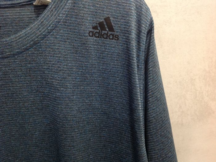 Tee-shirt manches courtes, col rond, pour homme. Taille XL. Couleur bleu cyan / gris, type jacquard (couleur dominante : bleu). Marque Adidas, gamme Freelift. Tee-shirt respirant qui garde au frais et au sec pendant les entrainements et par temps chaud. Composition : 100% polyester. Matière légère et confortable, coupe athlétique. Excellent état, presque jamais porté.