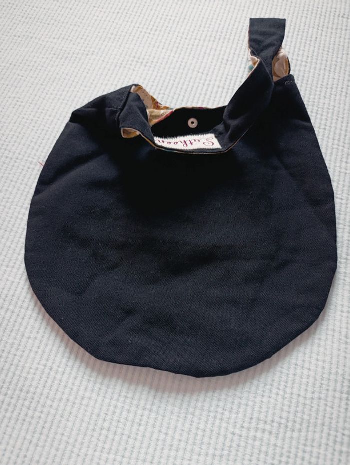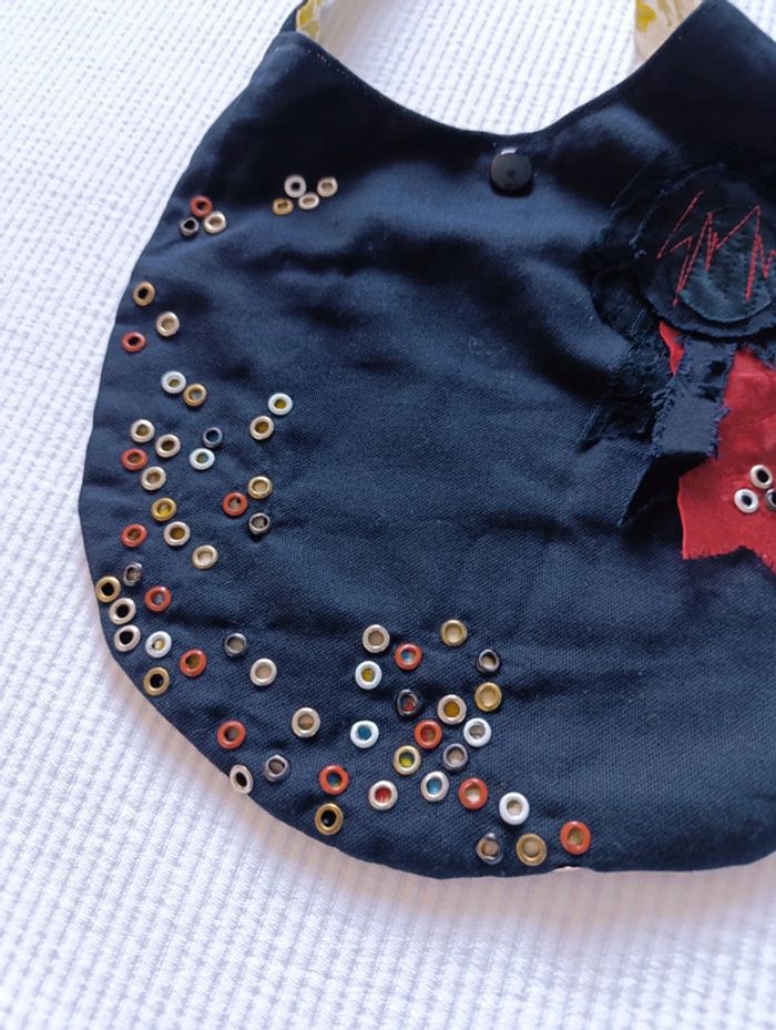 Petit sac à main style japonais Lutheen Fermeture par pression Poche intérieure Noir avec rubans et oeillets a l'extérieur Fleuri à l'intérieur Coton toile a l'extérieur Dimensions 29 x 25 cm Excellent état #Popsyslimaccessoiresac