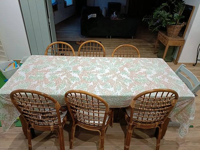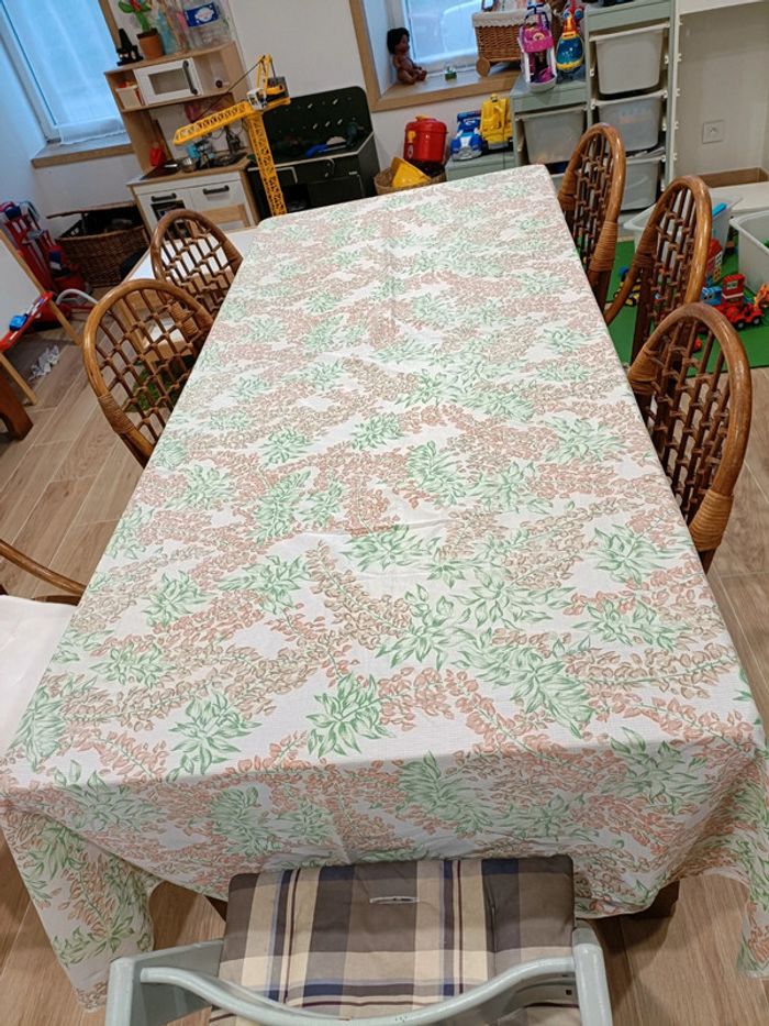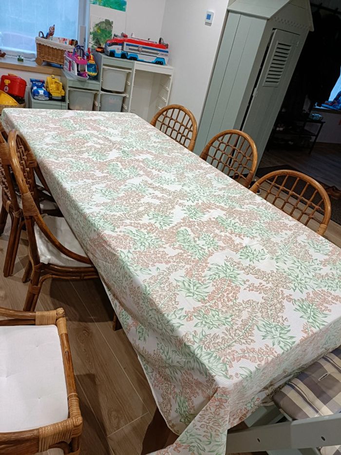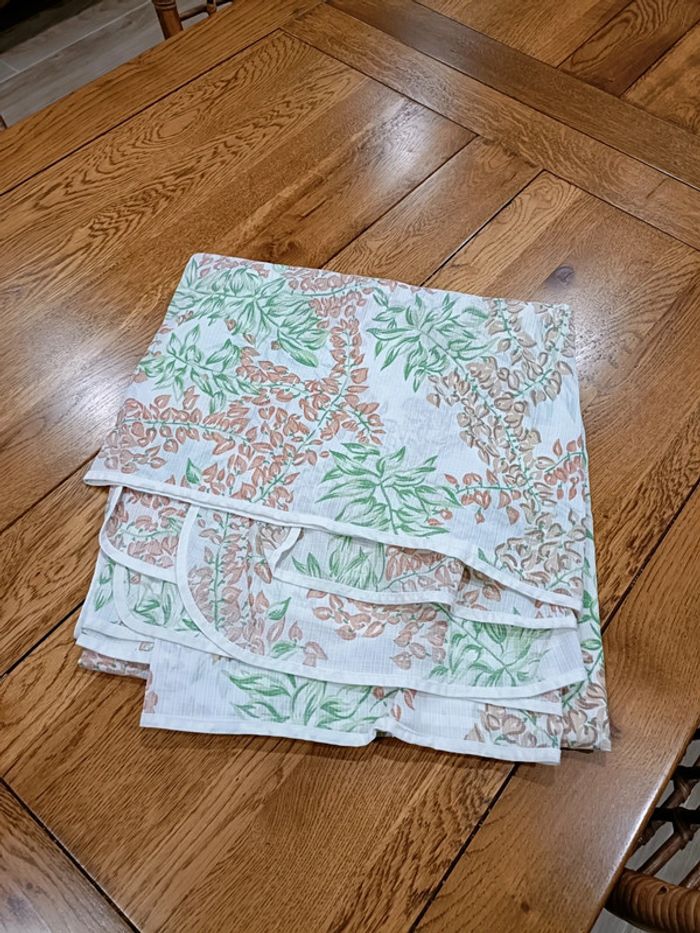 Nappe toute légère vintage que j'ai récupérée auprès de ma mamie Lavée pour la vente elle est toute propre, sent bon 🥰 Aussi beau en intérieur qu'en extérieur pour cet été Motif feuille, fleuri ultra actuel Très grande, convient à de belles tables. Deux défauts : une petite tache d'encre bleue et un petit trou à rapiécer. Très minime car on ne les voit même pas sur la photo dépliée. Sinon parfaite.