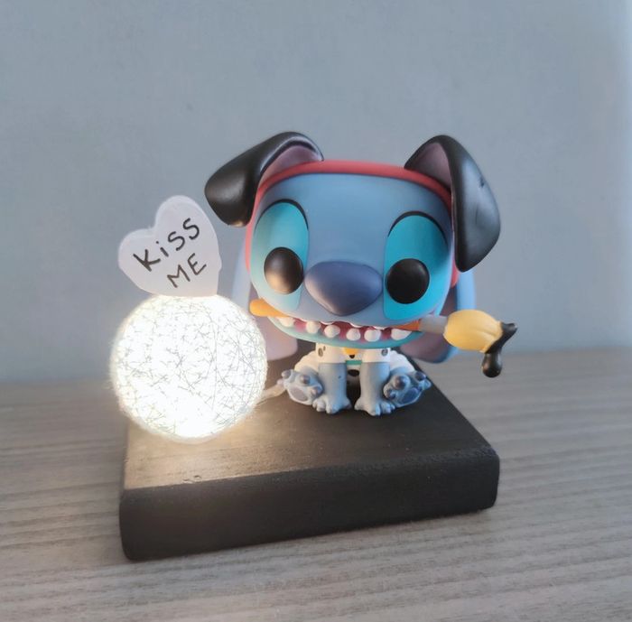 Décoration Stitch avec boule lumineuse sur socle en bois. Fonctionne avec deux piles plates et petit interrupteur
