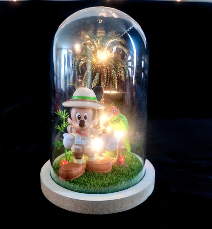 Mickey dans la jungle avec palmier lumineux . Sous globe plastique. Fonctionne avec deux piles plates