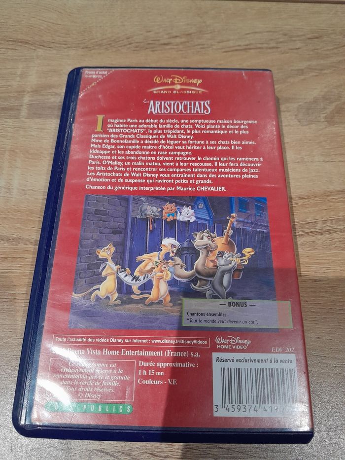 VHS Les Aristochas Grand classique walt disney. Boîtier abîmé voir photo. D'autres VHS de dispo dans mon dressing n'hésitez pas à jeter un coup d'œil ou à me demander
