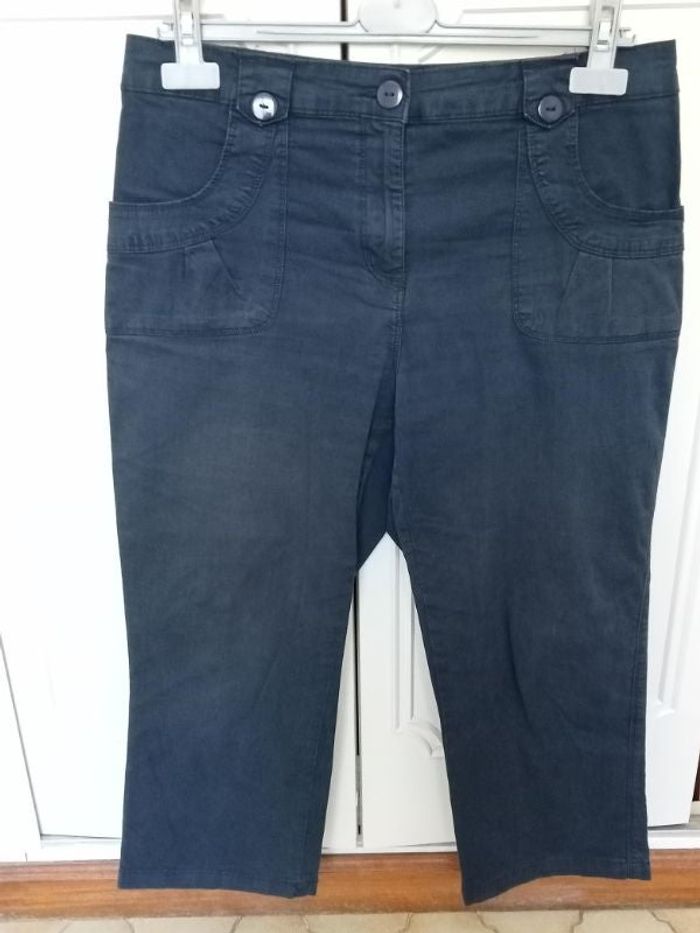 Pantacourt bleu marine de marque Blancheporte, taille 42. Longueur : 80 cm. Largeur taille : 41 cm. Largeur haut cuisse : 31 cm. Légèrement éclairci par le soleil, sinon très bon état.