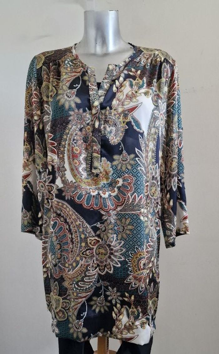 #adultebibisummer 🚩 vérifier vos mesures avec celles indiquées ✅ Tunique / Robe Imprimée - Jad Made in France - TBE - Taille notée 3 ✔ col V fermeture 3 petits boutons, patte de boutonnage couverte ✔ manches longues retroussables ✔ plis d'aisance au dos ✔ 100 % polyester - fluide - séchage rapide - sans repassage ✔ longueur 84 cm - largeur d'épaule 40 cm - sous aisselle 57 cm ✔ envoi rapide et soigné - remise sur lot