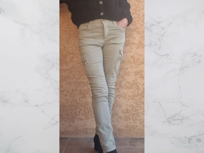 #adultebibisummer ✅ Pantalon beige kaki avec élasthanne Onado - TBE - Taille 36 ✔ taille extensible ceinture à passant ✔ fermeture zippée + bouton métal ✔ devant 2 poches + 1 petite poche monnaie ✔ côté 2 poches à revers fermeture par bouton pression et zip d'ornement ✔ au dos 2 poches ✔ 98 % coton - 2 % élasthanne (matière extensible) ✔ longueur 94 cm - entrejambe 68 cm - taille à plat sans étirer 33 cm ✔ envoi rapide et soigné - remise sur lot