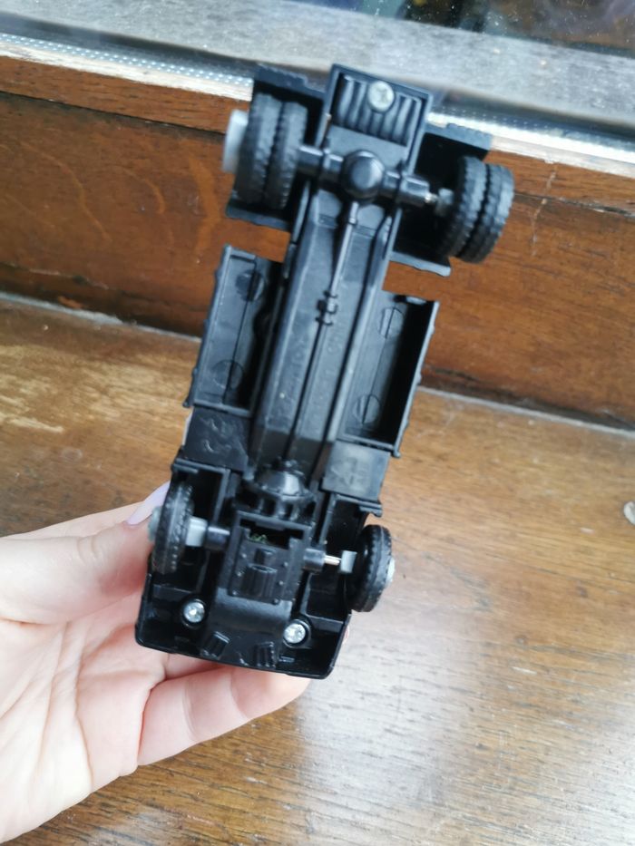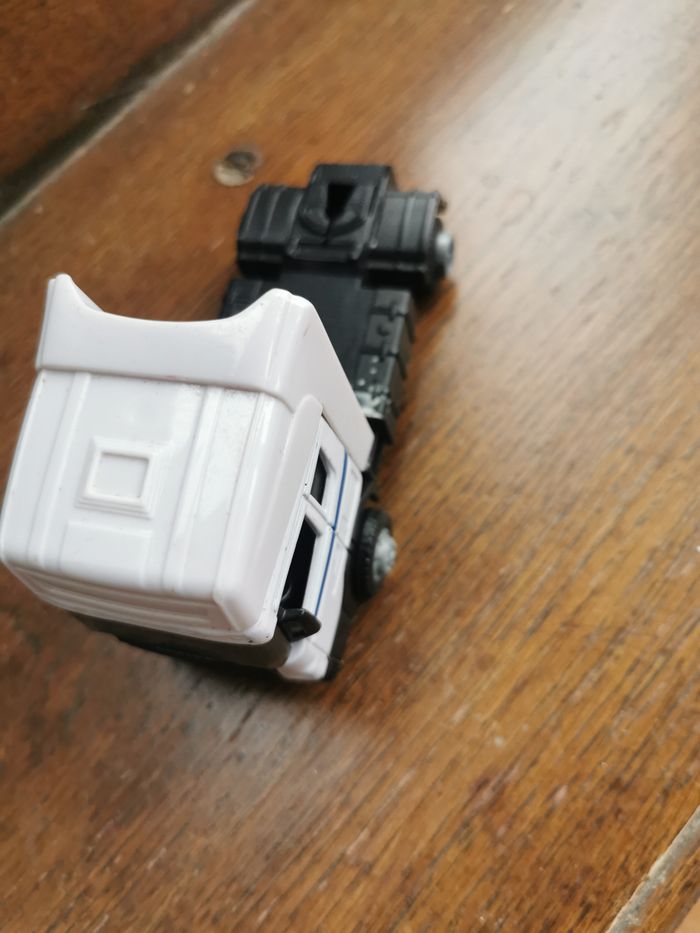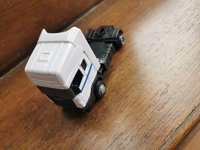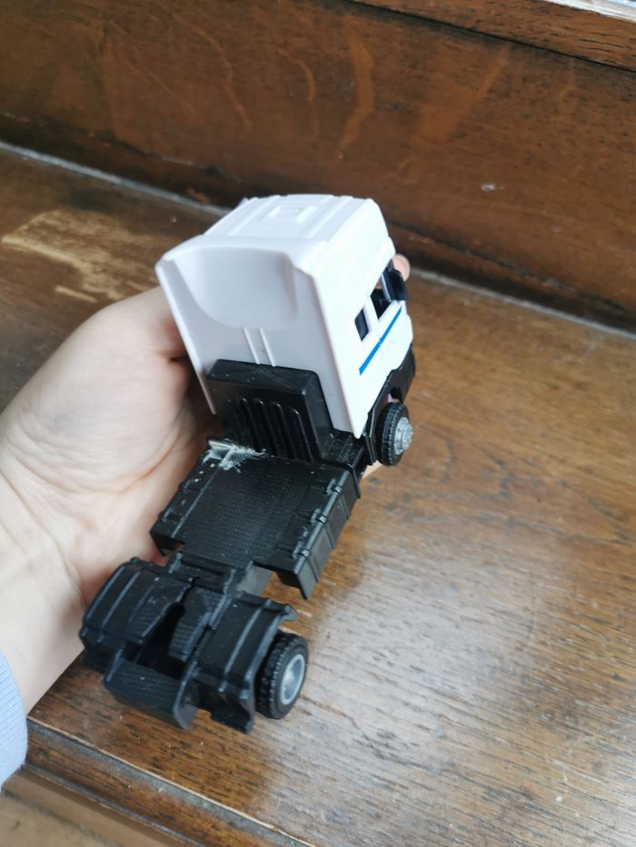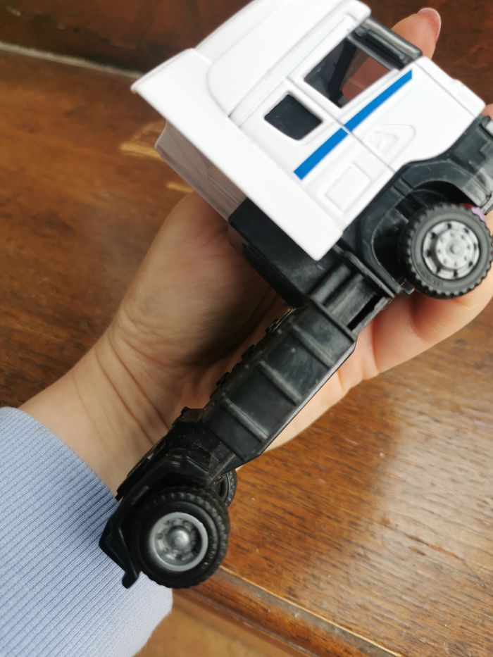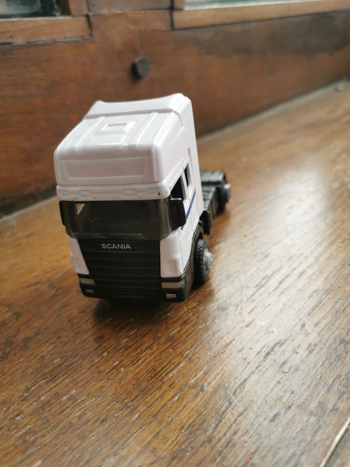 Jouet Camion Scania blanc Teama Toys, en plastique et métal, en très bon état général, taille 12,5x7,5x5,5 cm, poids 88g.