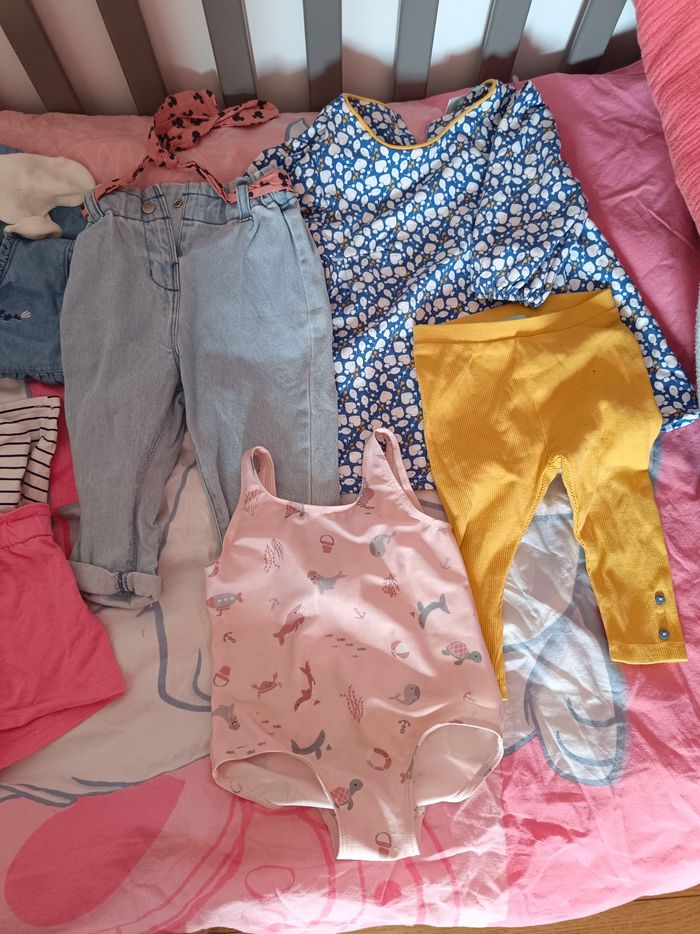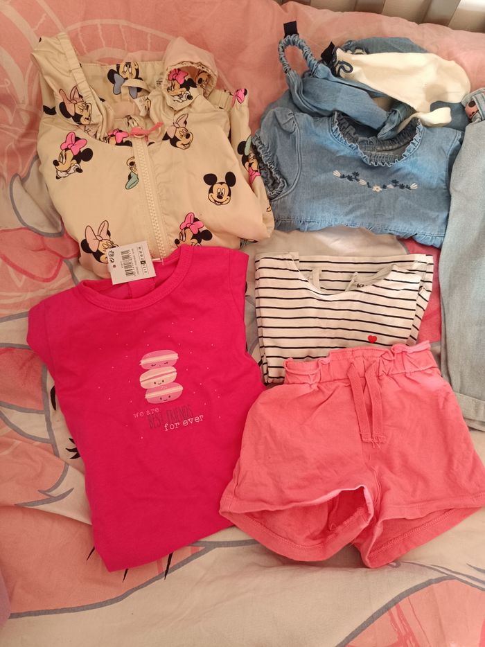 Plusieurs vêtements en taille 9 mois 1 kway H&M 1 pyjama ete neuf Kiabi 1 barboteuse Kiabi 1 short et 1 tee shirt Kiabi 1 jean Disney 1 ensemble haut manches longues + pantalon obaidi 1 maillot de bain H&M