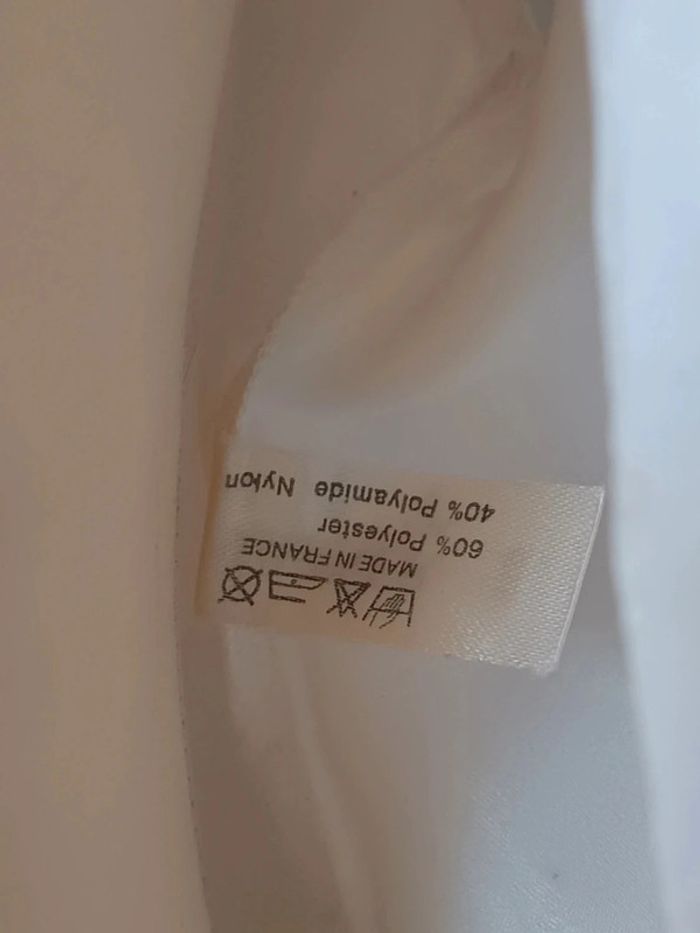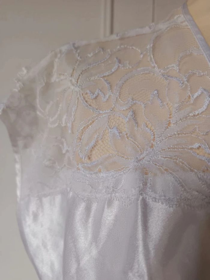 Etat impeccable Blanc éclatant ultra brillant Femme chic élégante Haut avec dentelle on peut rajouter un bouton pour le fermé T l 40 taille 3 Marque Warner polyamide nylon #hautbrillant #hautélégant #femmedentelle #workingwoman #classe #satin #soie