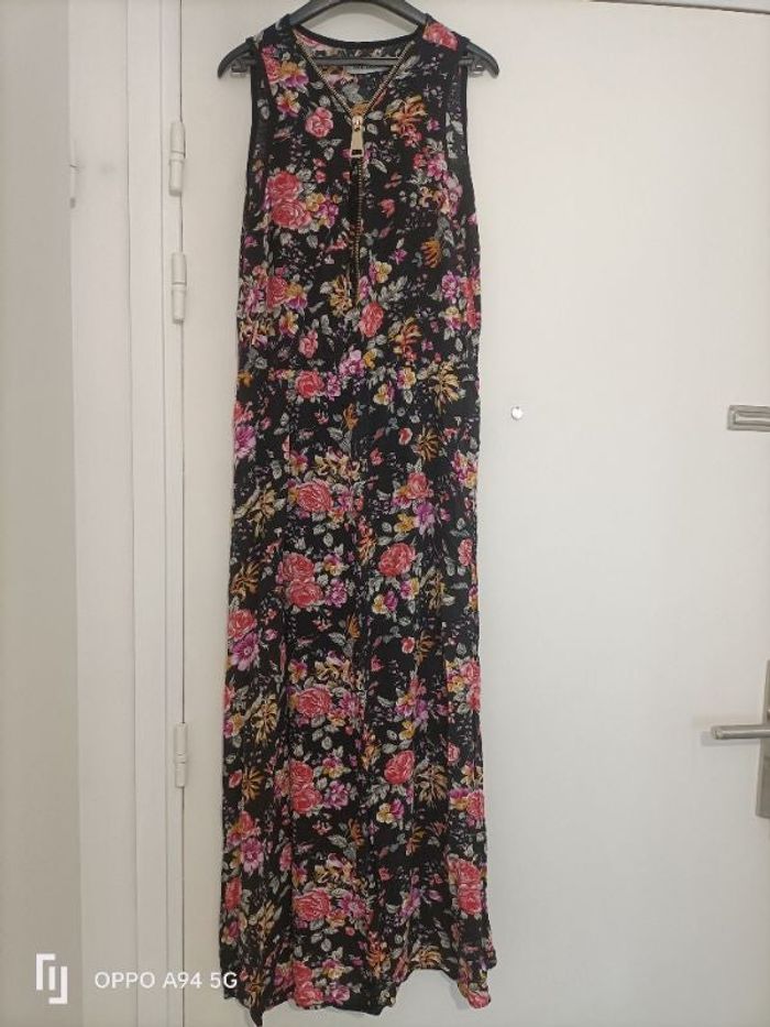 Robe longue légère non doublée, sans manches, élastique à la taille, col V fermé avec une fermeture éclair, largeur aisselle à aisselle 45cms, longueur 1m30, couleur find noir avec fleurs dominance rose