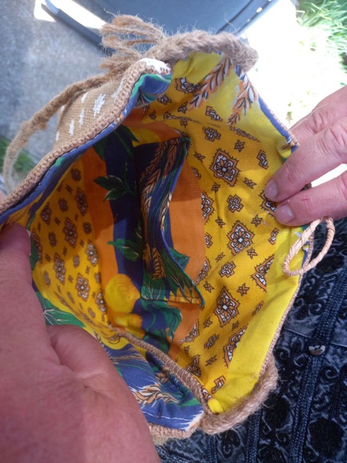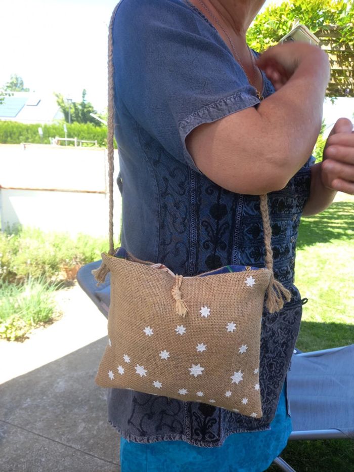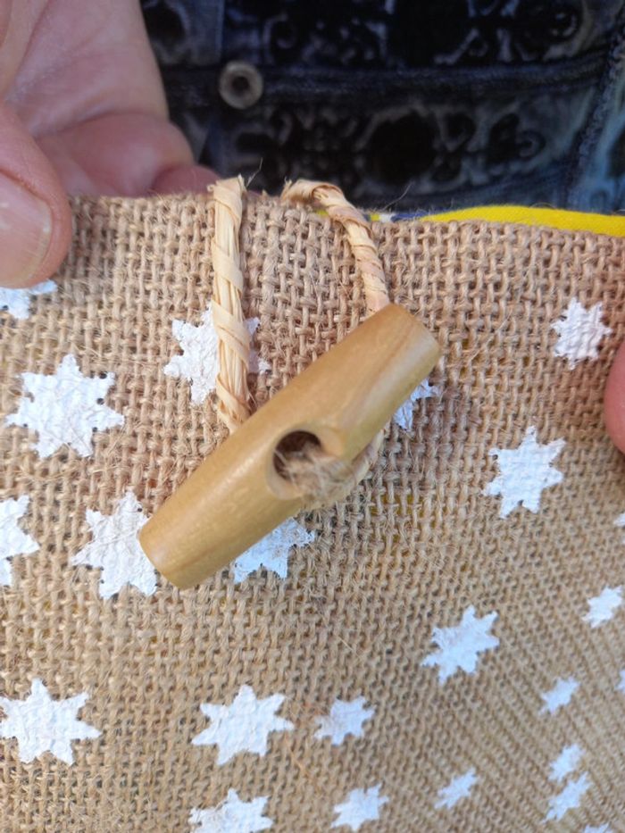 Sac en toile de jute motif étoile, intérieur tissu coton multicolore, poche intérieure, ferme par bouton en bois, anse en corde, dimensions 24cm par 21cm #fifi4935sac