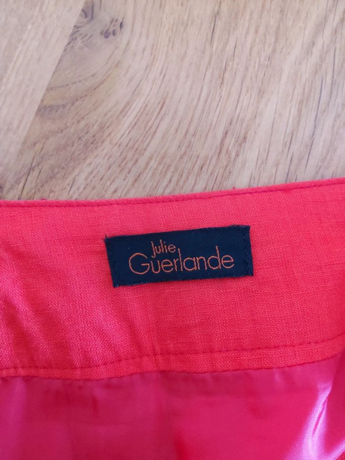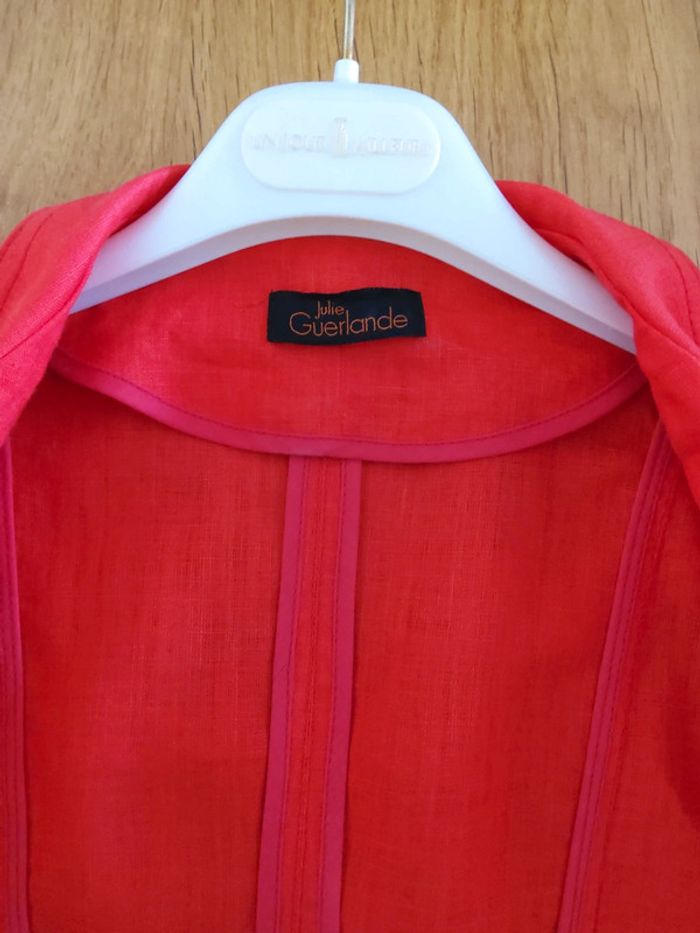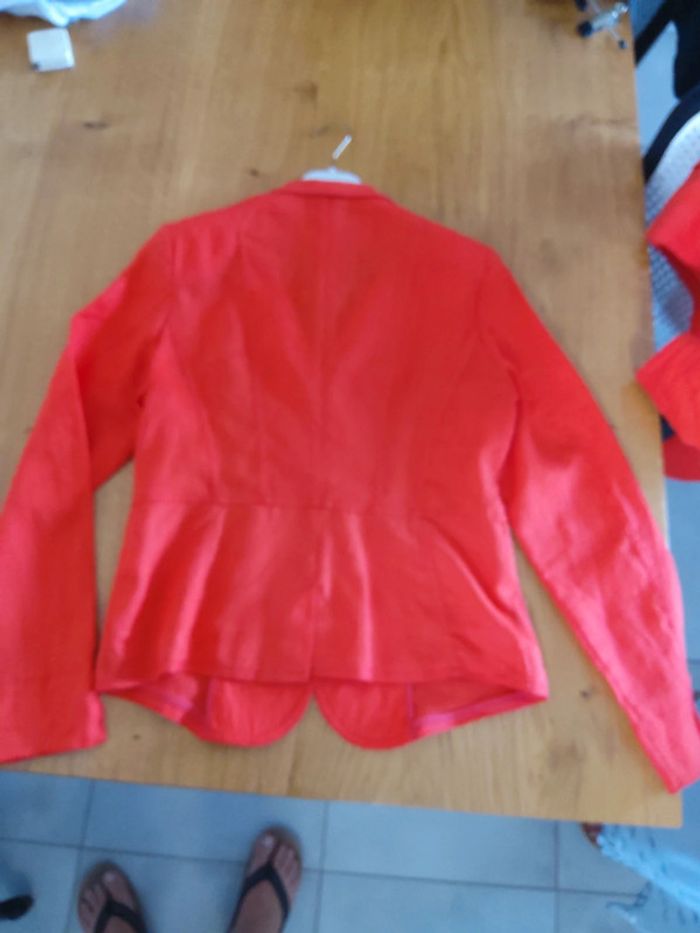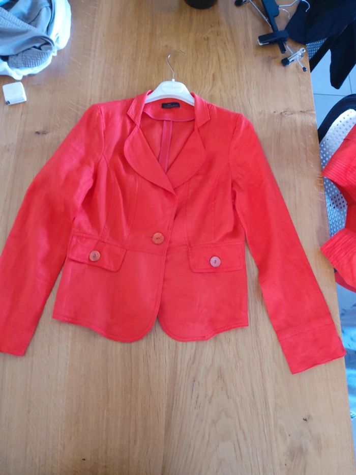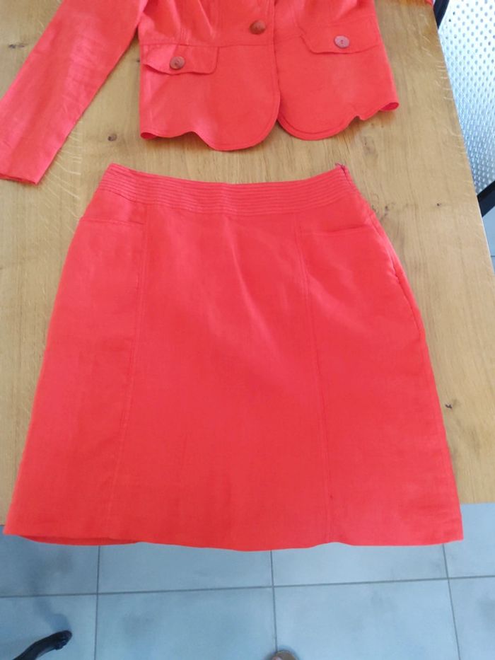 Tailleur jupe orange Julie Guerlande, 100% lin, porté 2 fois, jupe taille 38 doublée,longueur 50cm, 2 poches à l'avant et 2 fausses poches à l’arrière, veste cintrée taille 40, fausses poches #fifi4935femme38