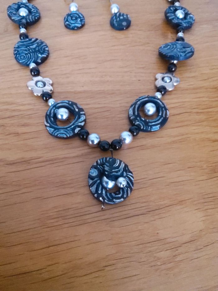 Collier et boucles d'oreilles assorties noir et gris irisé en pâte fine, longueur collier 37cm, boucles d'oreilles 6cm #fifi4935bijoux