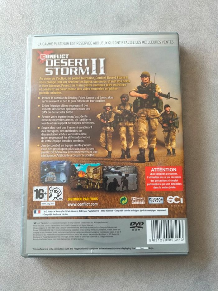 🎮 Plongez au cœur de l’action militaire avec ce jeu de tir tactique haletant sur PlayStation 2 ! • Jeu de guerre tactique en pleine tourmente urbaine • Incarnez des soldats d'élite issus des SAS ou Delta Force • Missions variées et immersion garantie • Version française complète • Boîte, notice et disque en bon état général (micro rayures présentes) Envoi possible avec soin ou remise en main propre à Saint-Herblain. #ps2 #conflictdesertstorm2 #jeuvideo #collection #retro #platinum #tacticalshooter #sony #retrogaming
