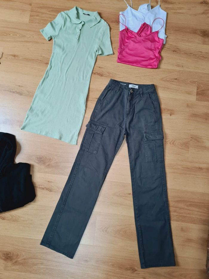 Robe menthe xs Gilet noir xs 2 bodies rose et blanc xs Pantalon cargo baggy straight 32 Pull fin vert xs Pull rayé xs Jeans bon état 32 Le reste très bon état, voir certains neufs #laetvict14ans