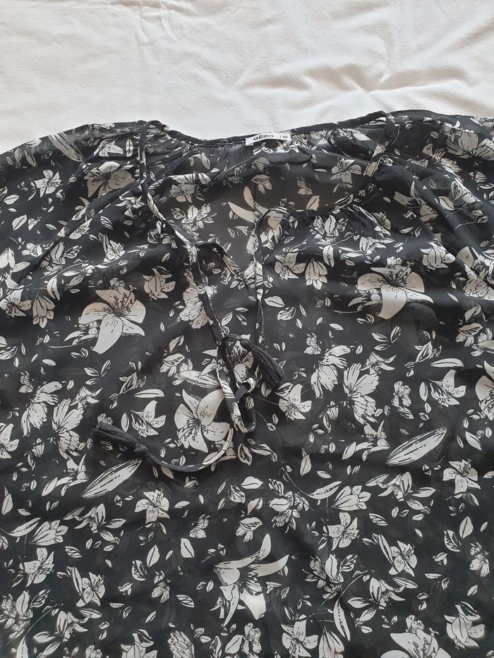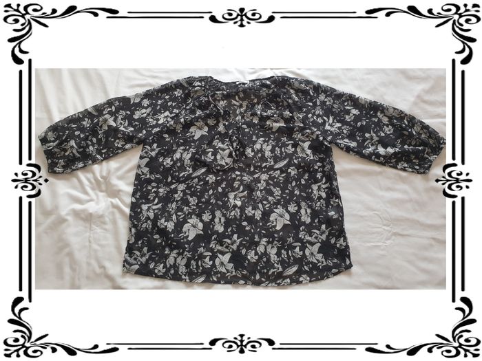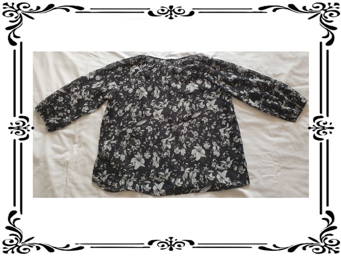 Tunique taille 48. Tunique manches 3/4 en voile transparente noire et blanche. Fentes sur les côtés sur 9,5 cm. Tissu non extensible. 100 % polyester. Largeur sous les bras : 60 cm Largeur à la taille : 62 cm Largeur en bas: 62 cm Hauteur du décolleté à partir des épaules: 12 cm Longueur totale: 67 cm Longueur des manches à partir de l’encolure: 57 cm En très bon état. Gémo. 3€. #vero38110vetementsfemme48