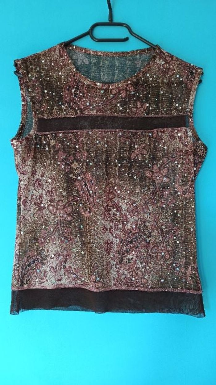 ❤Tee-shirt transparent marron avec strass et motifs vintage ❤ Taille 42 ❤ Fabrication Française ❤ Modèle déposé ❤ Très bon état ❤ #teeshirt #blouse #haut #marron #àmotifs #strass #vintage #taille42 #fabricationfrançaise #transparent #leger #automnal #modeldepose #promod #beige #vetementT42selena2477